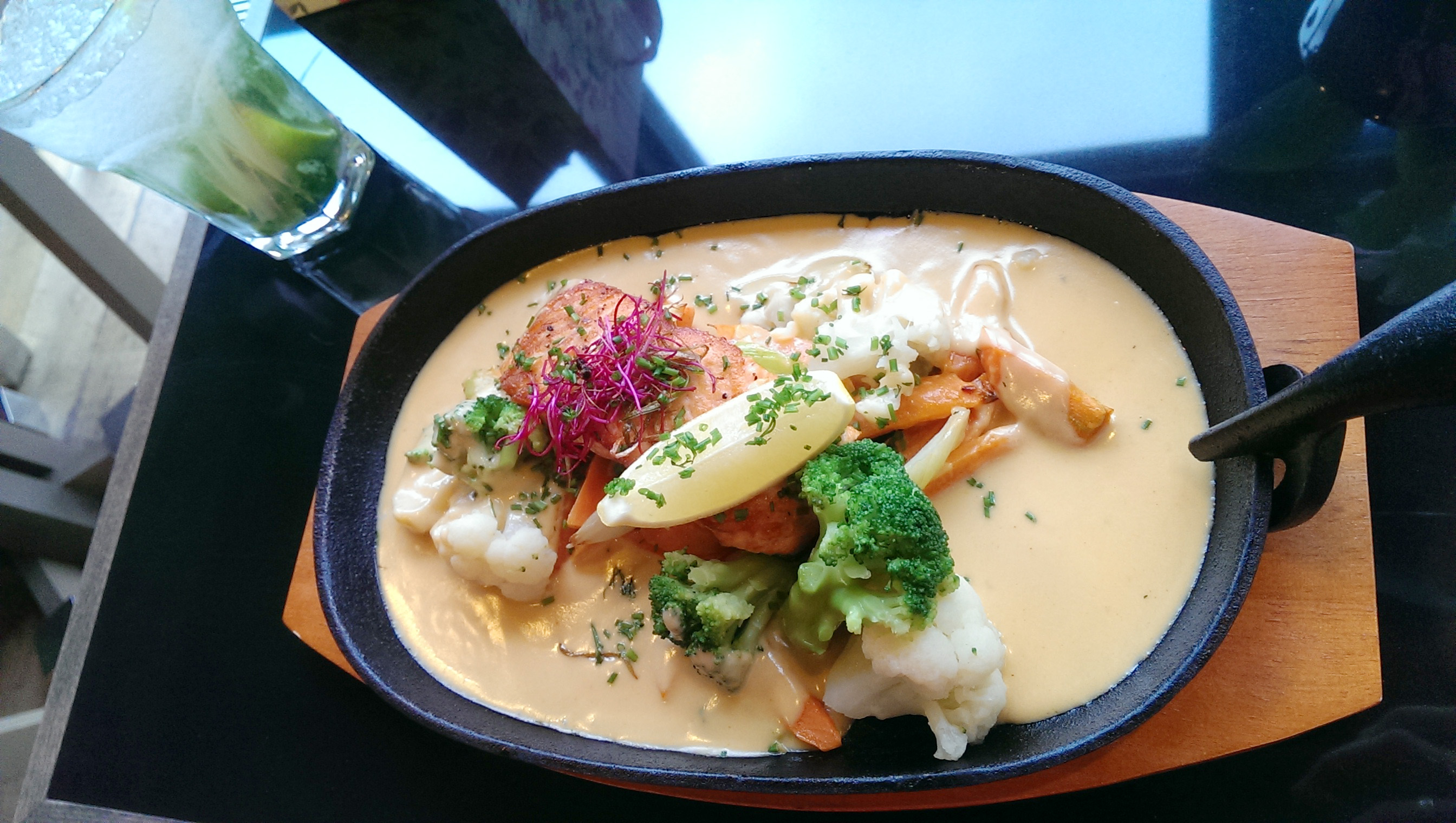 Выстрел второй — запечённый лосось. Филе на “хорошо”, за счёт того, что пропиталось обильно соусом. Соуса из морепродуктов было целое озеро. Догадались положить в сковороду (хоть так) с высокими бортиками — иначе на столе точно был бы всемирный потоп. С гарниом фантазия повара не разыгралась — всё те же пресные варёные цветная капуста, брокколи и морковь.