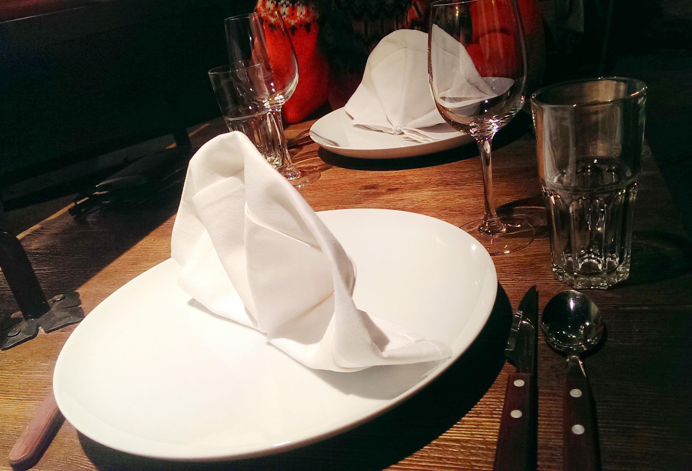 Drawbacks: dinnerware is placed directly on naked table. Yes, there is a textile napkin, but it was twisted into a shell on my plate. Better make an envelope of it for forks-knives. Napkin-swans and other animals are not for this place at all. This is not haute cuisine, so better be simple. And please, do not bring away a plate from one guest, whereas other haven’t finished his dish. I don’t mind about my empty plate for some time, and my guest won’t choke in a hurry.