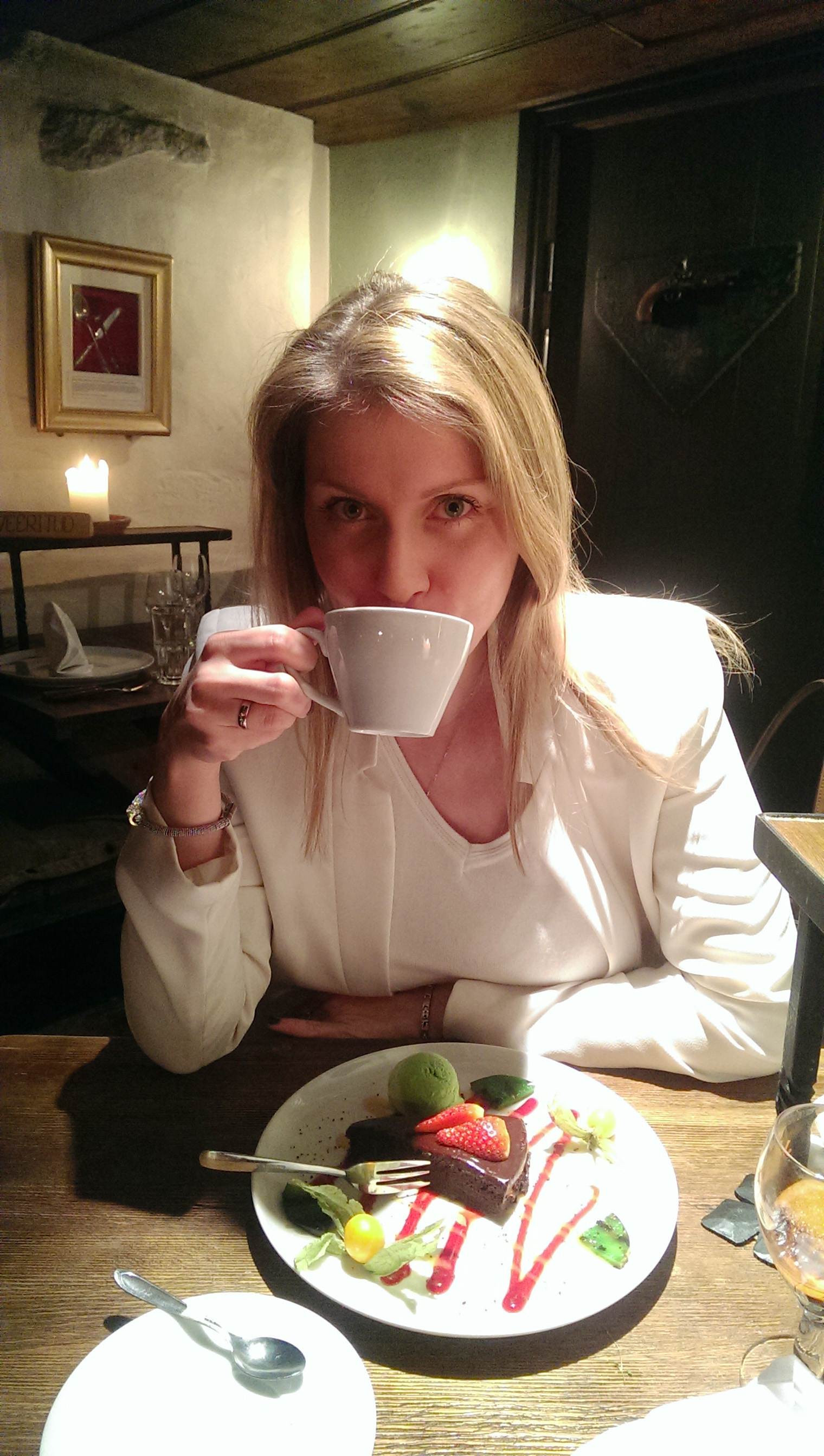 I peaked which desserts ordered neighbour tables and decided — I won’t take that for sure. By elimination method I picked chocolate tart with mint ice-cream. Tart itself was tender as a cream, almost like fondant. But really disappointed its clumsy surrounding. Seems all right, but my intuition says “something is missing”. Especially was surprised by grill-kiwi pieces. Grill… I can give only such explanation to those strange black stripes on a lemon before and a kiwi here.