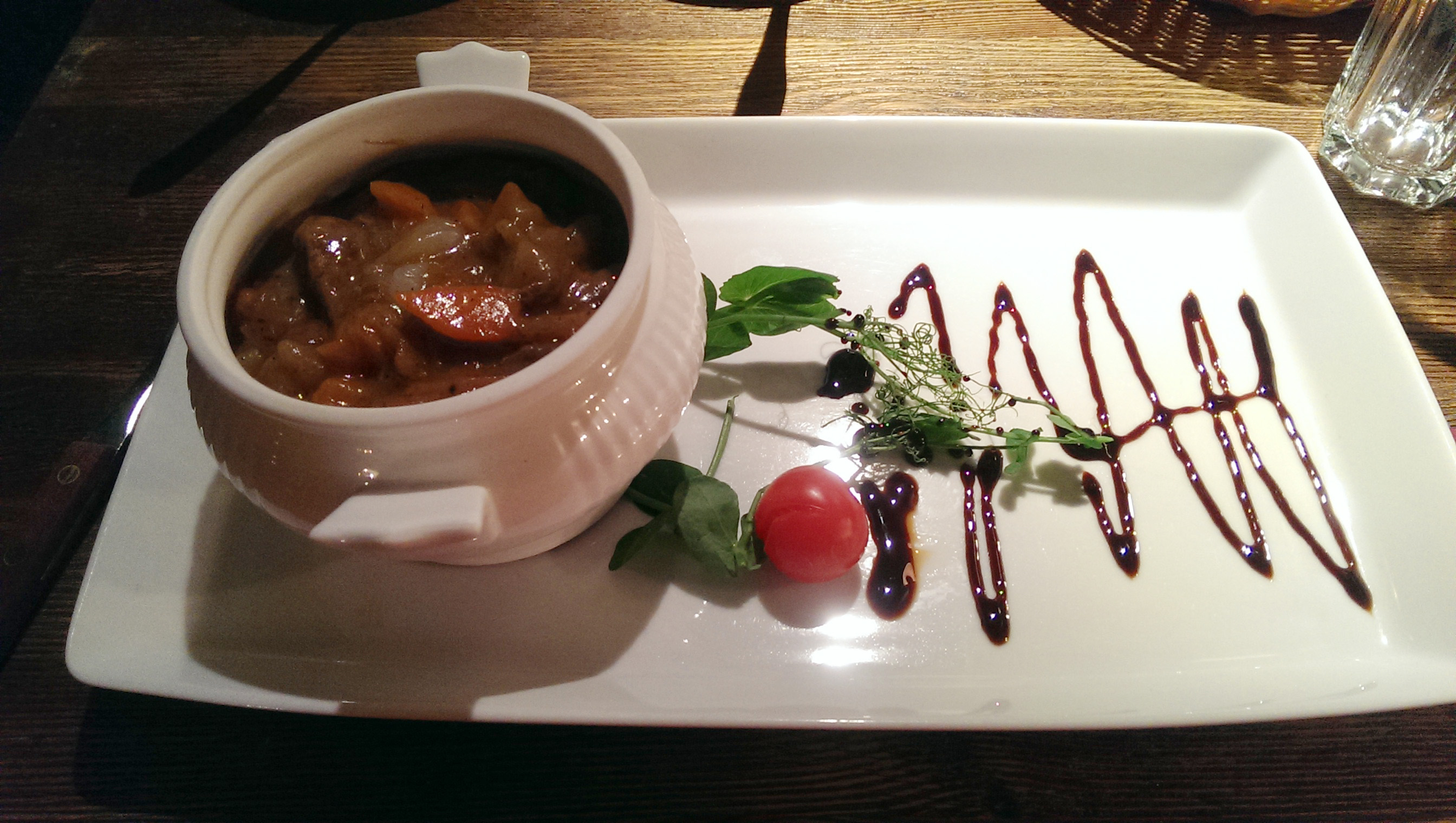 I ordered one of the classic dishes from French cuisine for first — smoked cheese soup. Waitress brought it — juts imagine — in whole tureens and proudly poured into my plate. For one person tureen is a lot, regardless the soup is a delight. First it seems like melted Mereväik, but the you start to feel strong tart aftertaste. It’s served with garlic croutons — tender steaming soup and crust of bread you will remember for long.