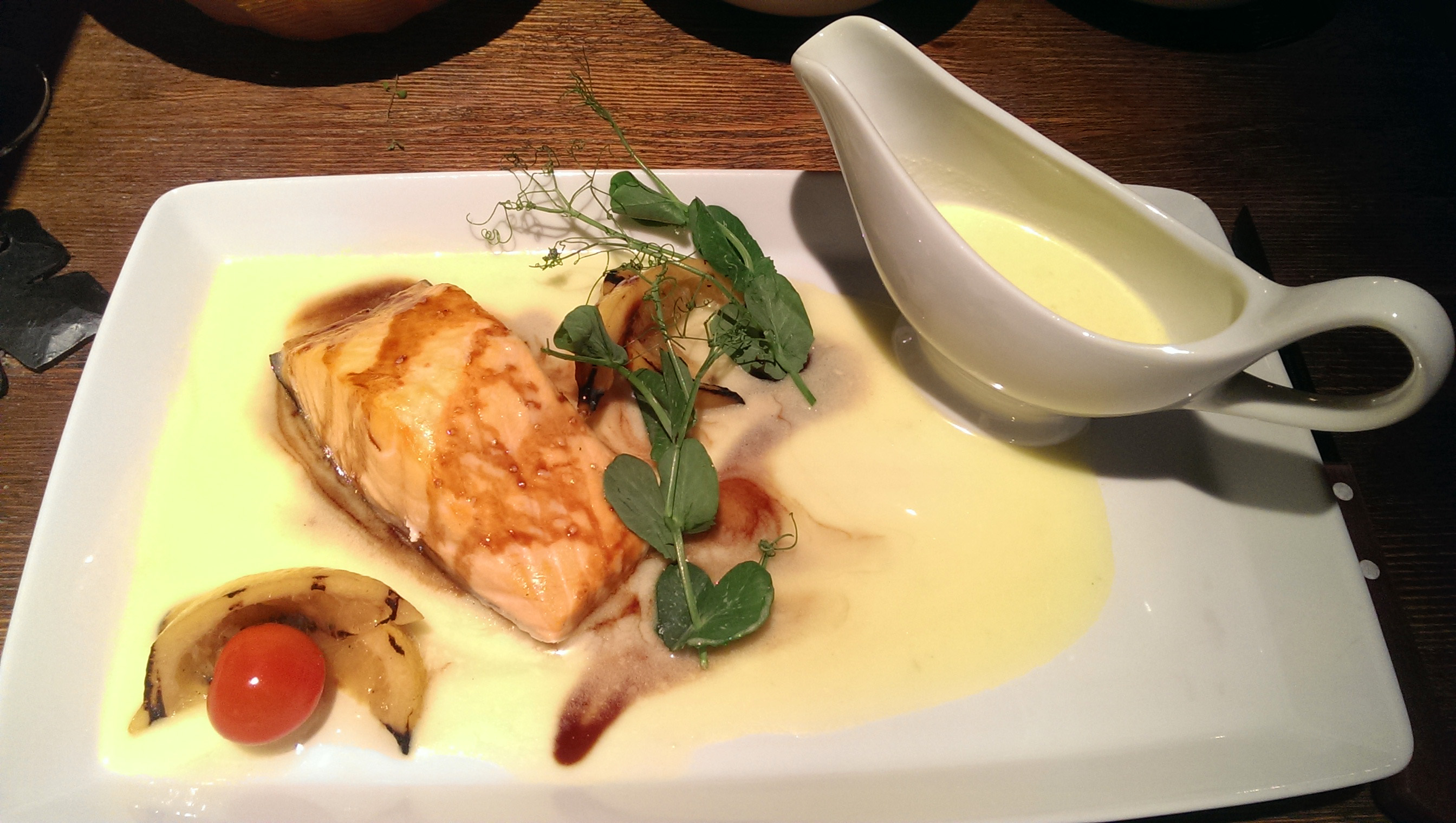 Inspired by balsamico, I set high hopes for my next choice — baked in white wine trout, under butter-lemon sauce. Sliced well, with a pleasant colour and a smell fish without a single bone — I picked right. Why waitress asked about it being cold or uncooked (?)… Only balsamico was here unnecessary. Noticed that it’s poured here almost on every dish. By the way, I couldn’t squeeze a drop from the lemon — it was bitter and sluggish grilled-lemon. Misunderstood turn-off for me.