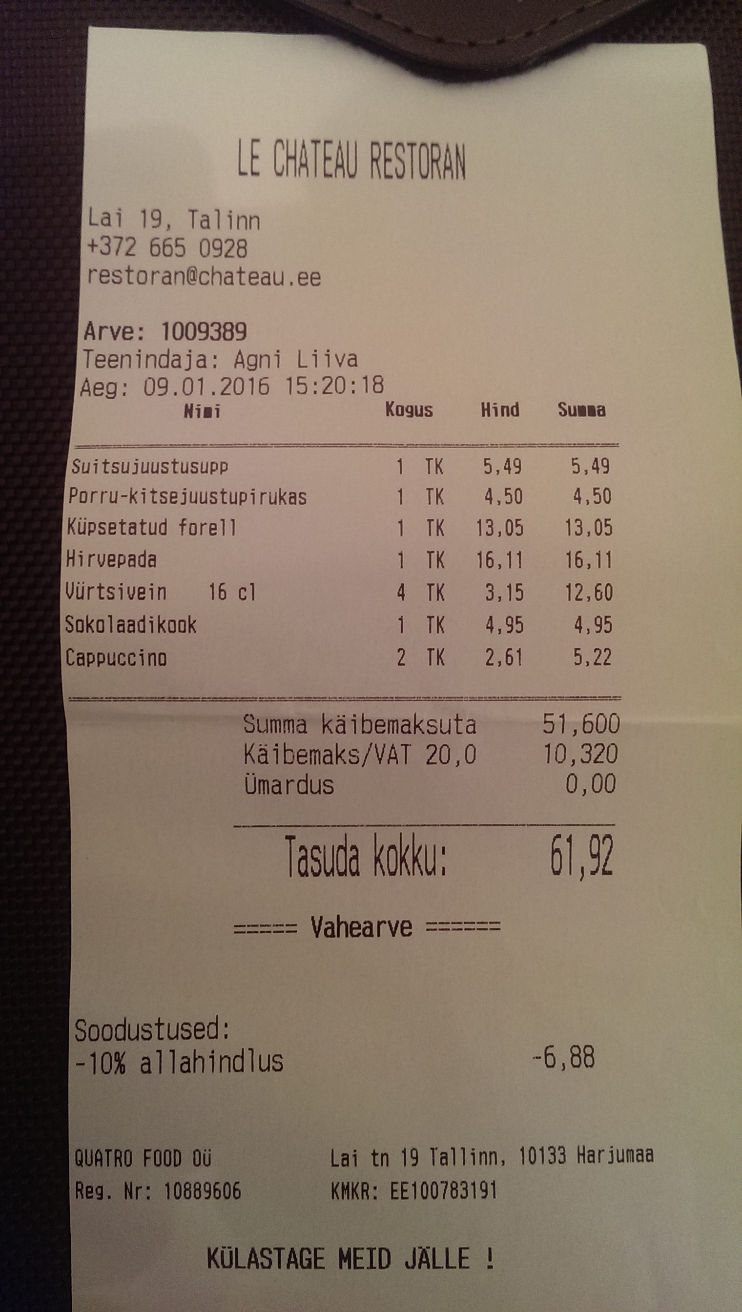 Average bill per person is 30 euros. This time I got lucky with a discount: -10% for each newly-registered user on service GetTable. Alas, discount is one-time only, but you can involve your friends or family members. Then you get the sweet feeling of saved money for a bit longer time,