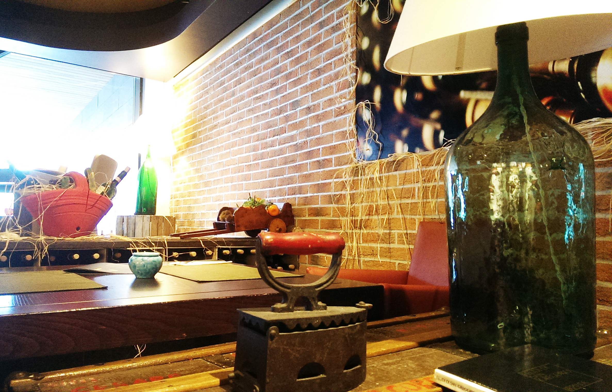 Интерьер. Советую сесть в первом маленьком зале, под лозами винограда. Здесь рябит в глазах от количества напичканных деталей, но всё как-то немыслимо подходит друг другу. Настоящая голубая плитка из Амальфи, коллекция вин, деревянные столы, клетчатые скатерти – здесь я быстро ассимилировалась. Официант подпевает всем песням: конечно же, звучат только ему родные. Приходит местная la famiglia, не стесняясь матерится (ну я ж не понимаю), откушивает и весело уходит. Как у себя дома, а я– у них в гостях.