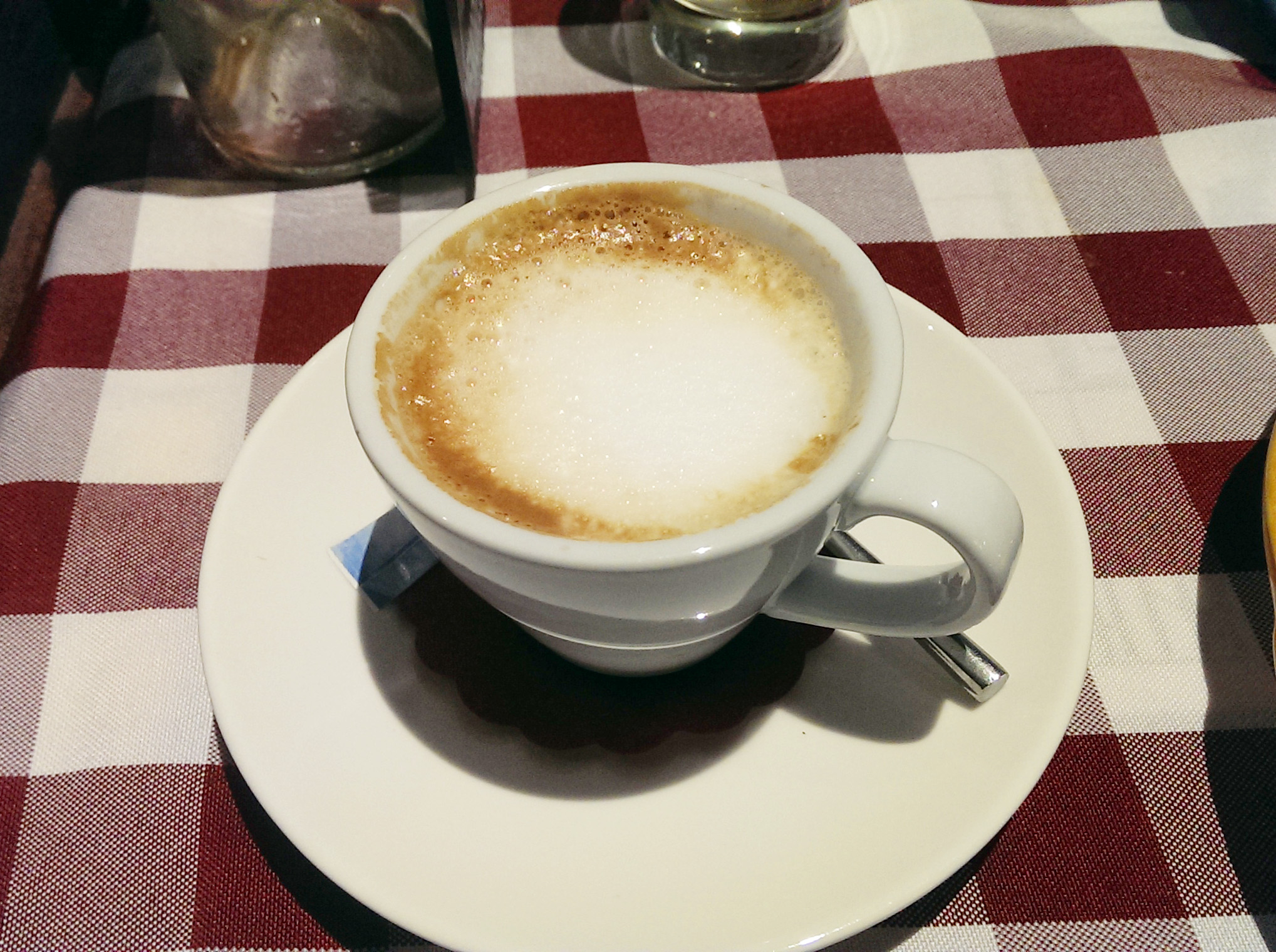 Капучино подаётся в очень маленькой чашке — не как во многих наших заведениях. Вкусное, крепкое. Отличное завершение обеда.