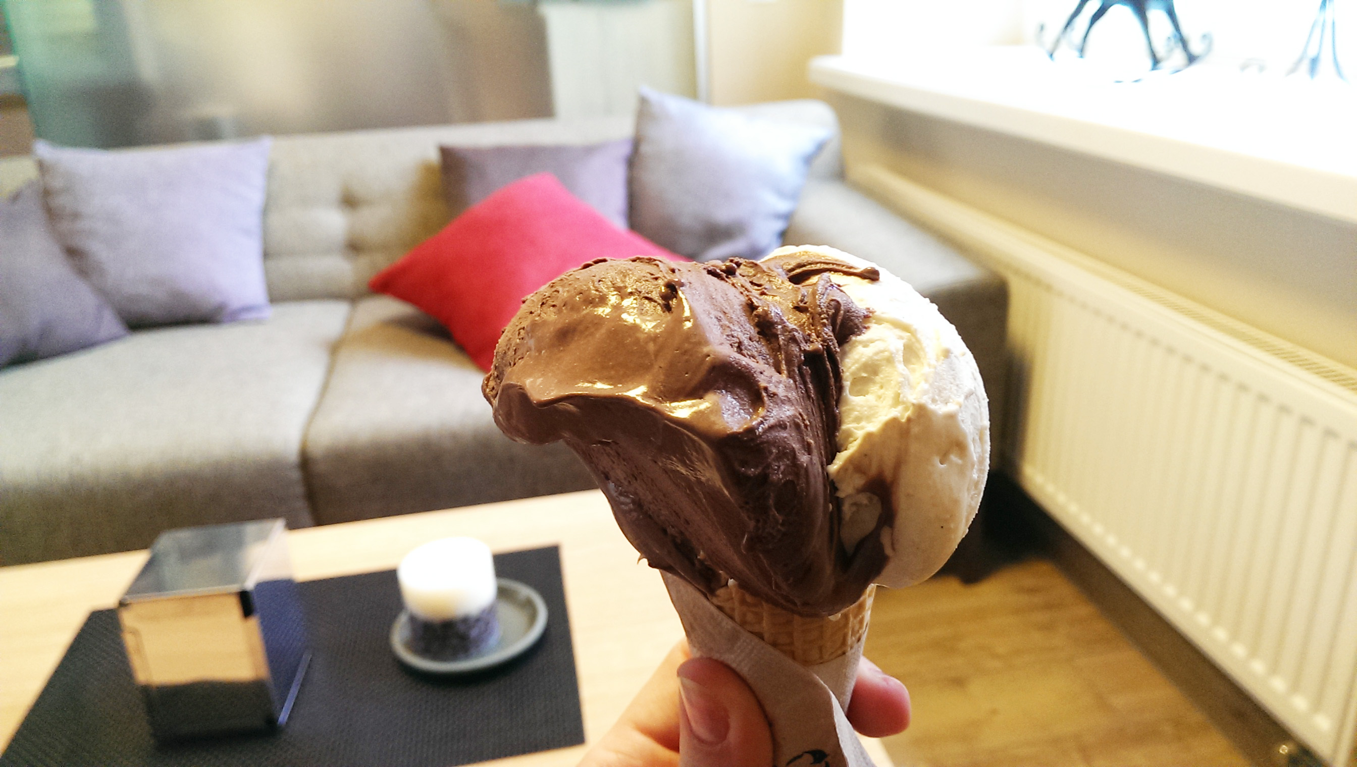 Interior. Cafe is very clean, small and accurate. There are sofas near the walls, so you can totally relax. Pity, no terrace, but windows look to Lühike street and inner yard, so you won’t get a basement feeling. Entertainment for the guests — good music track-list and a Laboratoruim — ice-cream making room. To tell the truth, I often myself stick to the window as a kid to glance at the process.