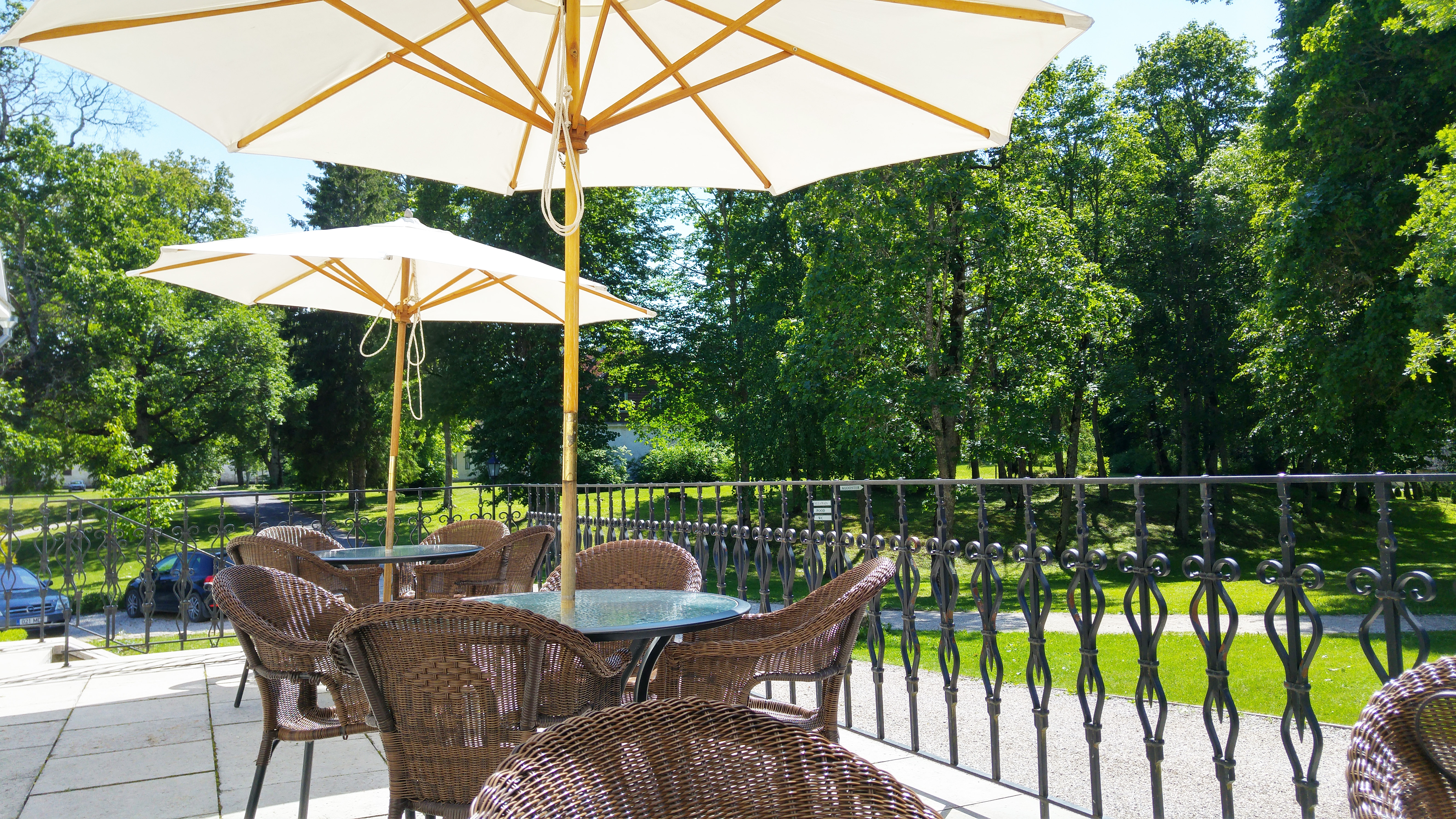 На террасе обедать не менее приятно, чем внутри. Радует глаз не озеро, а вид на парк и монастырь. Зато от красивой сервировки не осталось и следа: простые металлические столики и более-менее комфортные стулья. Хотелось бы какую-нибудь мягкую подушку под чресла или под спину подложить, но, к сожалению, не нашла. Вместо текстильных салфеток уже бумажные, кстати. Словом, чуть впечатление смазывается, поэтому для тех, кто приедет сюда в первый раз — сначала обедайте внутри поместья.