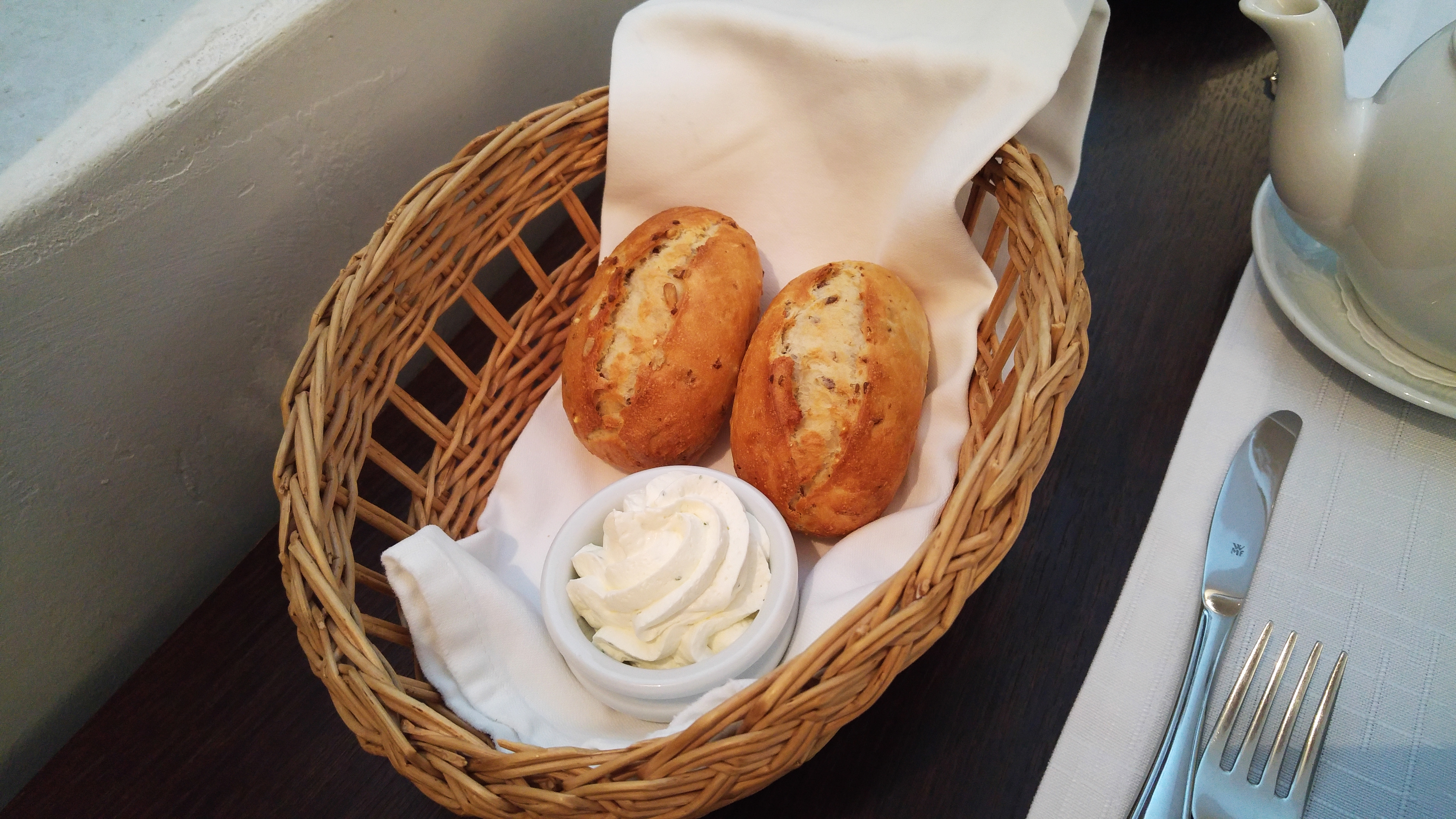 Хлебная корзинка — хорошие румяные, разогретые в духовке булочки. По одной на каждого гостя, так что если хотите добавки — запаситесь терпением на очередные минут 20.