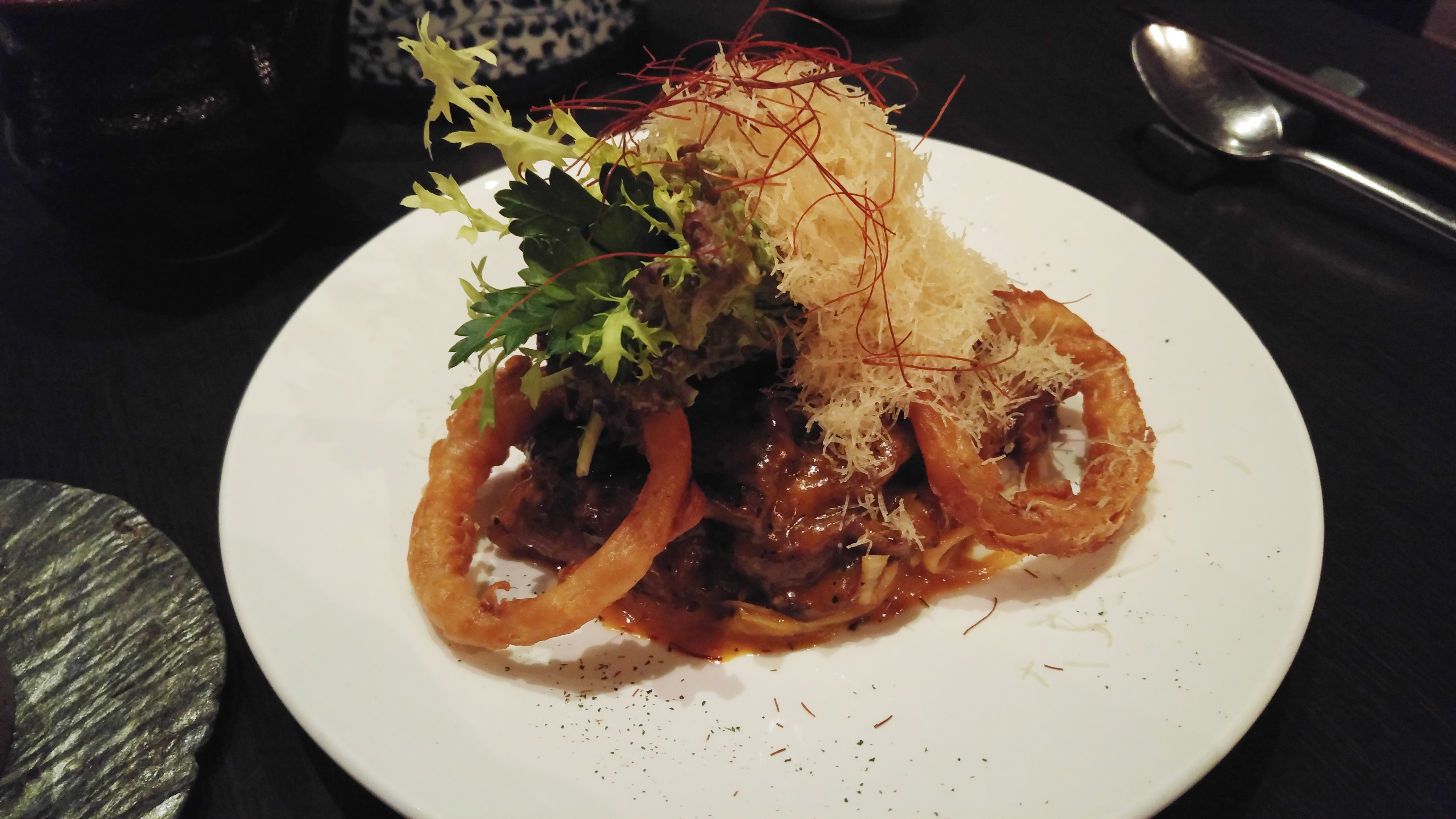 Soft thin slices of meat on an onion pillow under spicy sauce. There was enough venison to try with every meal ingredient and create own unique mix. Sauce resembled well-seasoned with chili soy sauce, and at same time it was sweet, sticky and lip-burning. Meal opened new flavours with each layer: here’re merry rice-noodles, crispy and oily as chips. Here’re deep-fried onion rings – extra rich garnish, and from light side – slightly bitter salad-roll. Here’s white rice accompanied by very salty soy sauce.