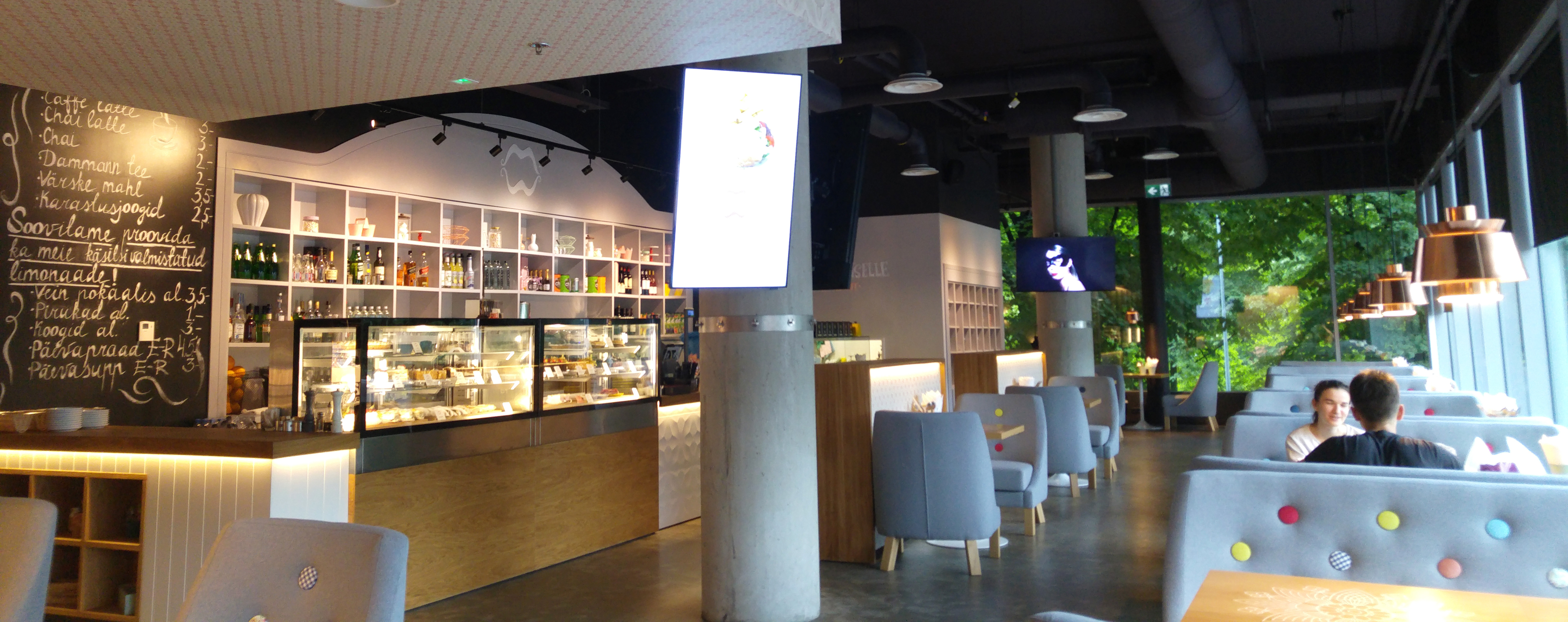 Some recent time ago here stood in beauty classic white leather chairs and cosy sofas, glass chandeliers and rooms were beautifully decorated per each season and festive. It has always been appealing to return here over and over again. Alas, soft furniture was substituted with hard benches at the windows, chairs textile was changed to screaming bright horror – all at sixes and sevens. Good there were added a coffee quotes to the slate walls and the view from the window was not closed.