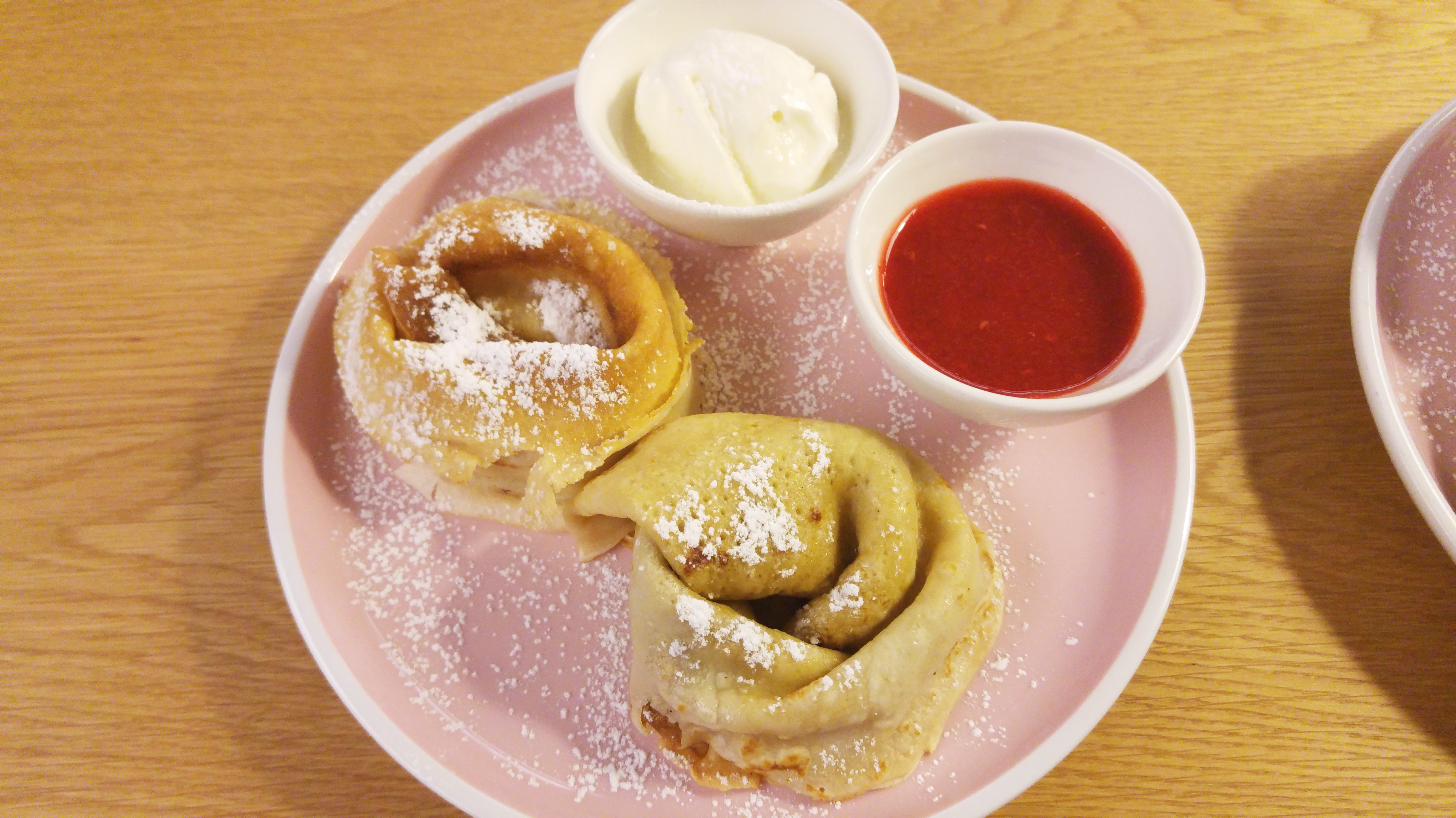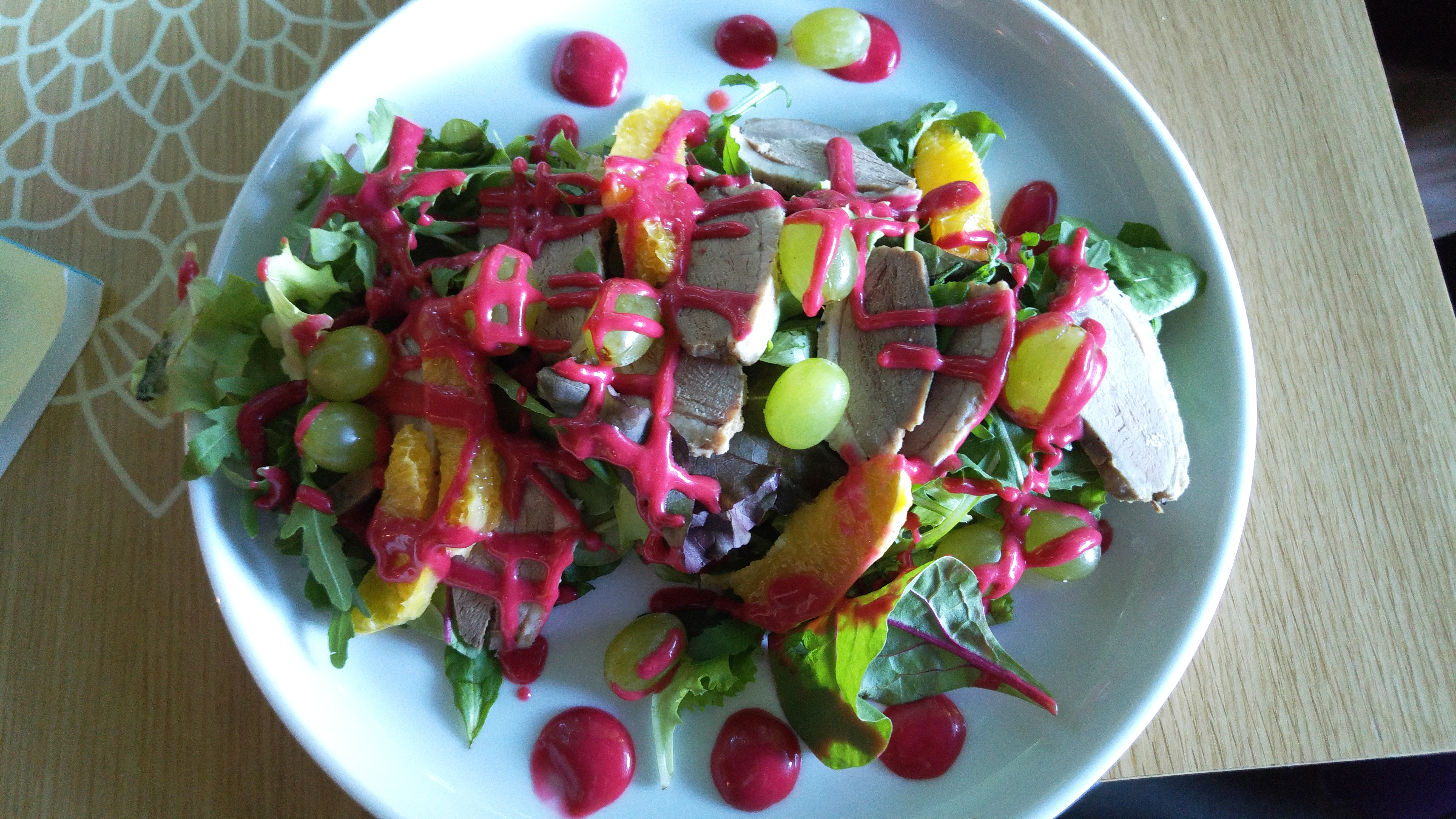 Выбор на перекус или легкий обед гораздо обширнее, чем у предыдущих кафе: закуски, салаты, горячее, десерты и детское меню. Раз предлагают, то надо брать. В этом месте привелось пробовать чаще всего блины, пару раз салат с уткой, ассорти мороженого, кофе и какао. Нежные блины – вкусные каждый раз, подаются с мороженым, вареньем и медом. Салат с уткой чуть суховат, и ядреный бордовый соус не спасает; утка оба раза была жесткой и пережаренной. Кофе латте или капучино еле теплое при подаче.