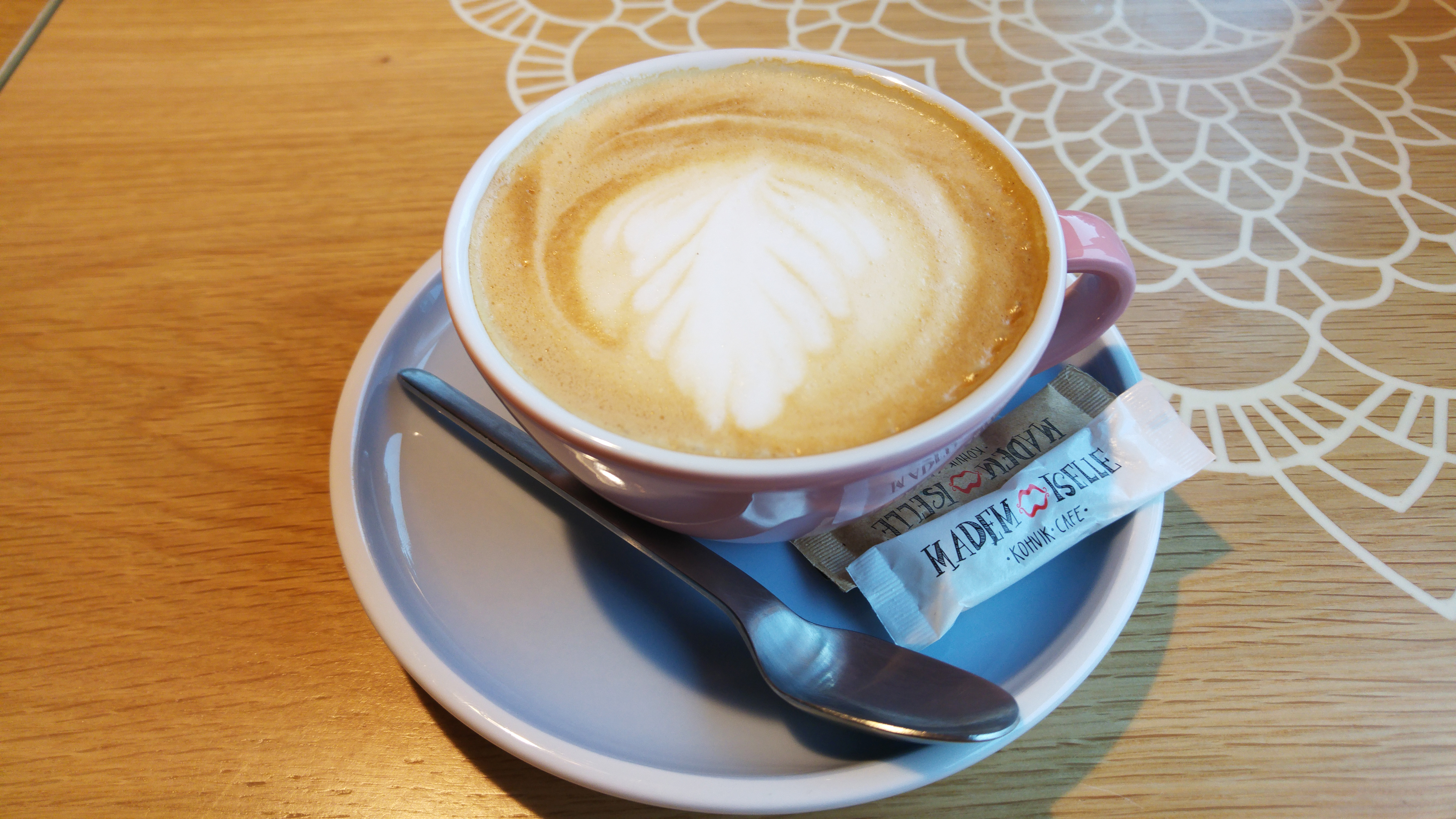 Menu provides for short bite or light lunch wider offer than in previous cafes: starters, salads, hot meals, desserts and children’s menu. Have it – take it. At this Mademoiselle I tried pancakes, duck salad couple of times, ice-cream selection, coffee and cocoa. Tender pancakes are good and savour each time, served with ice-cream, jam and honey. Salad with duck was a bit dry and its acid-bordo sauce didn’t save it; duck meat both times was hard and overcooked. Latte and cappuccino arrived barely warm.