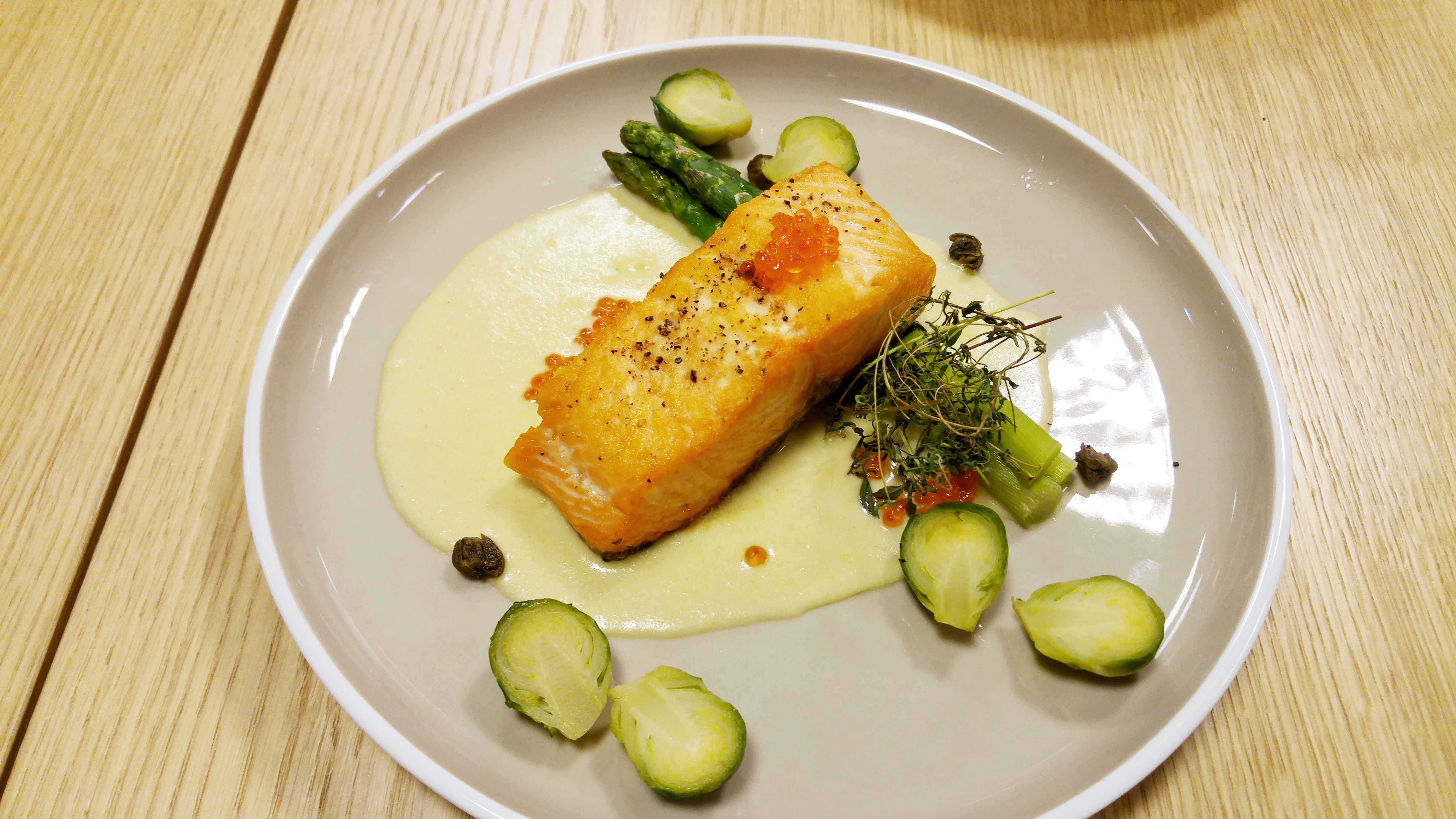 Menu is identical to the one in Solaris centre, makes happy with colourful food photos, but disappoints in taste. Last couple of times meal preparation took 40 min and coffee 15-20. Again I calm myself with usual tantra “I just get lucky”. With taste is same old story – I’m “super-lucky”. Quiche with cheese, ham, salad and mayo – edible, big chunk enough for a single portion, but very fatty and salty. Cesar salad must be wiped off the Earth, because, I think, nowhere it is cooked at least appealingly. I asked without dressing – they mixed mayo anyway; chicken was overcooked, dry and too spiced with pepper. Salmon with greens – a “masterpiece” per 14 EUR, from which I only managed to swallow fish fillet. Fair good fish, by the way. Dried-up herbs ball, faded asparagus and cabbage were left untouched as long as the sauce.