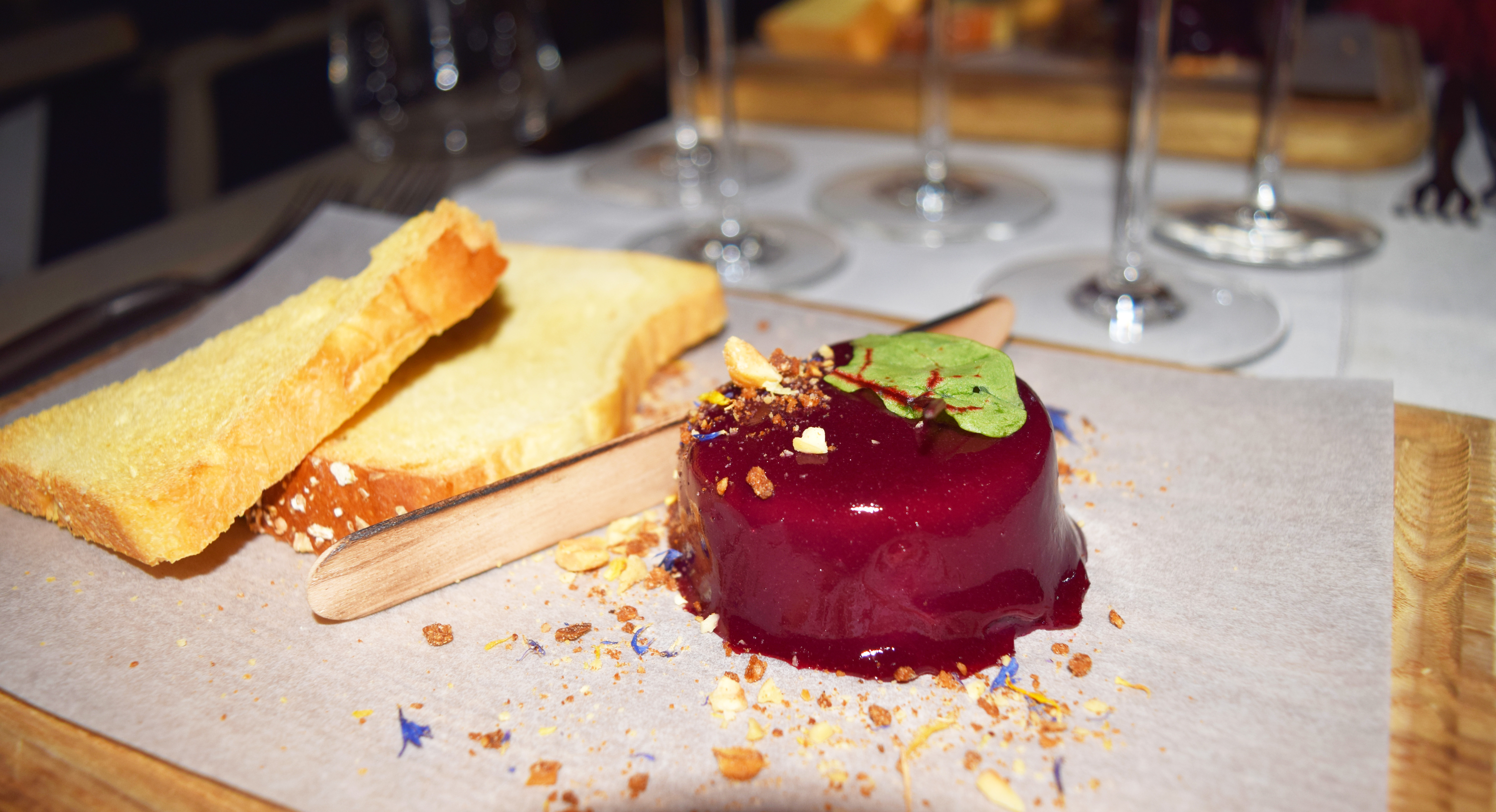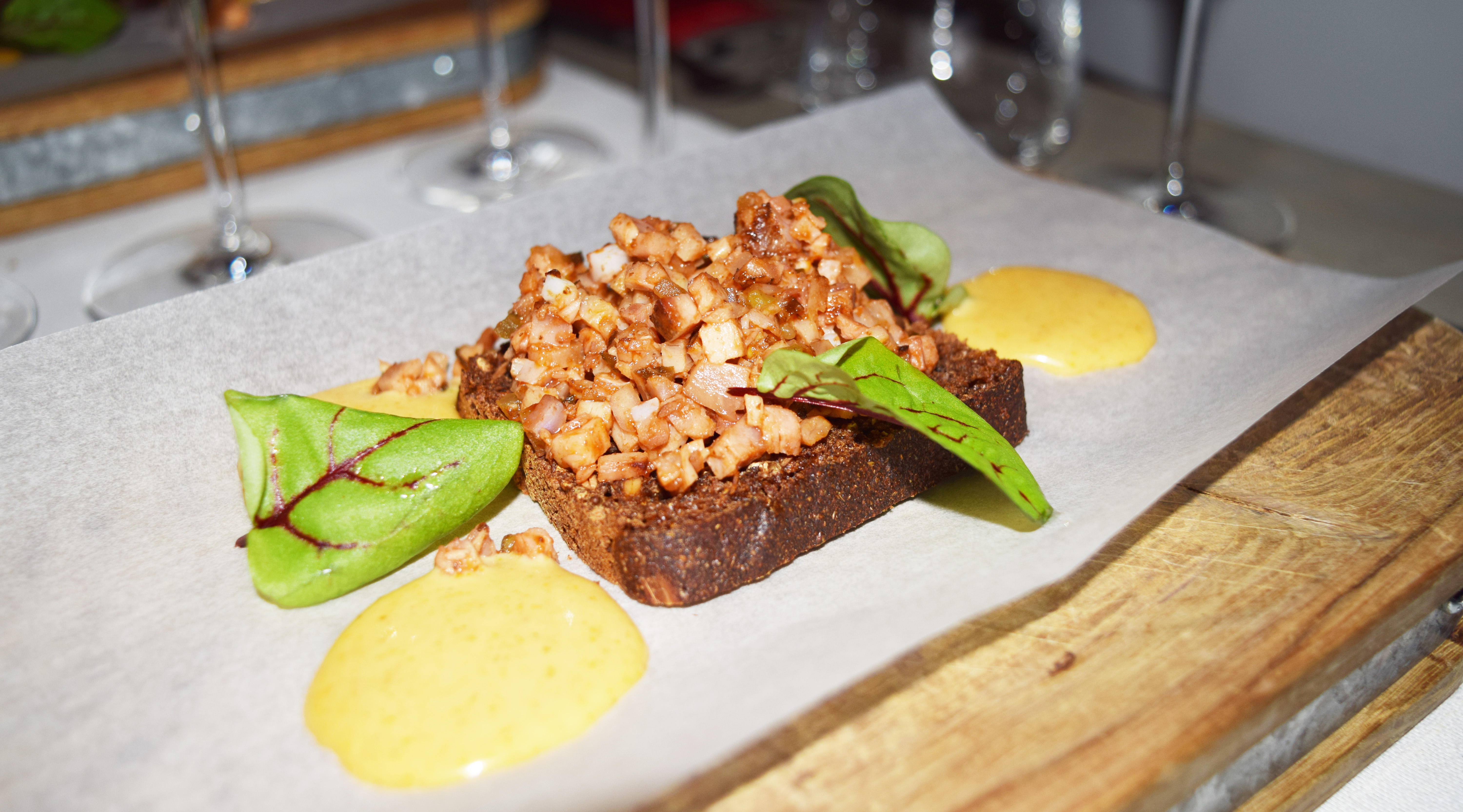 Закуска первая – паштет из лосиной печени с глазурью из черной смородины на обжаренной домашней булке Farm. Pâté из местных продуктов так же вкусен, ярко приправлен и для первой закуски достаточно тяжел. Паштет чувствовался чуть кисло-сладковатым, скорее всего, из-за тягучей ягодной глазури. Ореховая крошка тоже была весьма кстати, а вот чего точно не хватило, так это еще одного золотистого тоста.