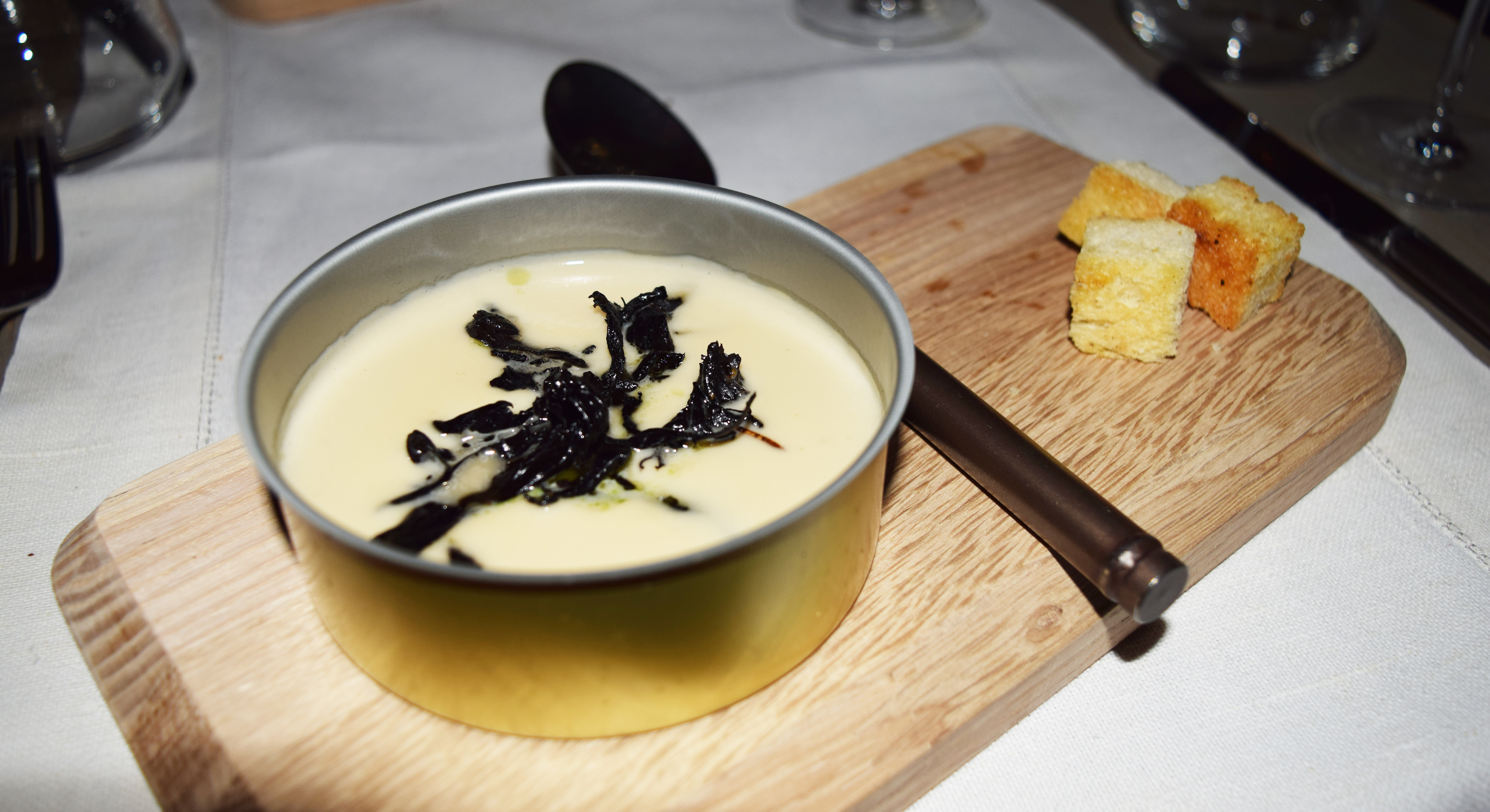 Назовем сезонным супом или Кремовый суп с сельдереем и черными лисичками, подается с хрустящей булкой. Чуть сладкий, послевкусие как от жареной зелени типа шпината. Лисички выглядят несомненно эффектно на светлой глади супа, на вкус похожи на вакаме салат. Лакомый суп, легкий, незамысловатый и тем привлекательный в своей простоте. Кстати, вся кухня такая у ресторана и у новогоднего сета. Гостям точно нравится – слышала по столам довольный шепот.