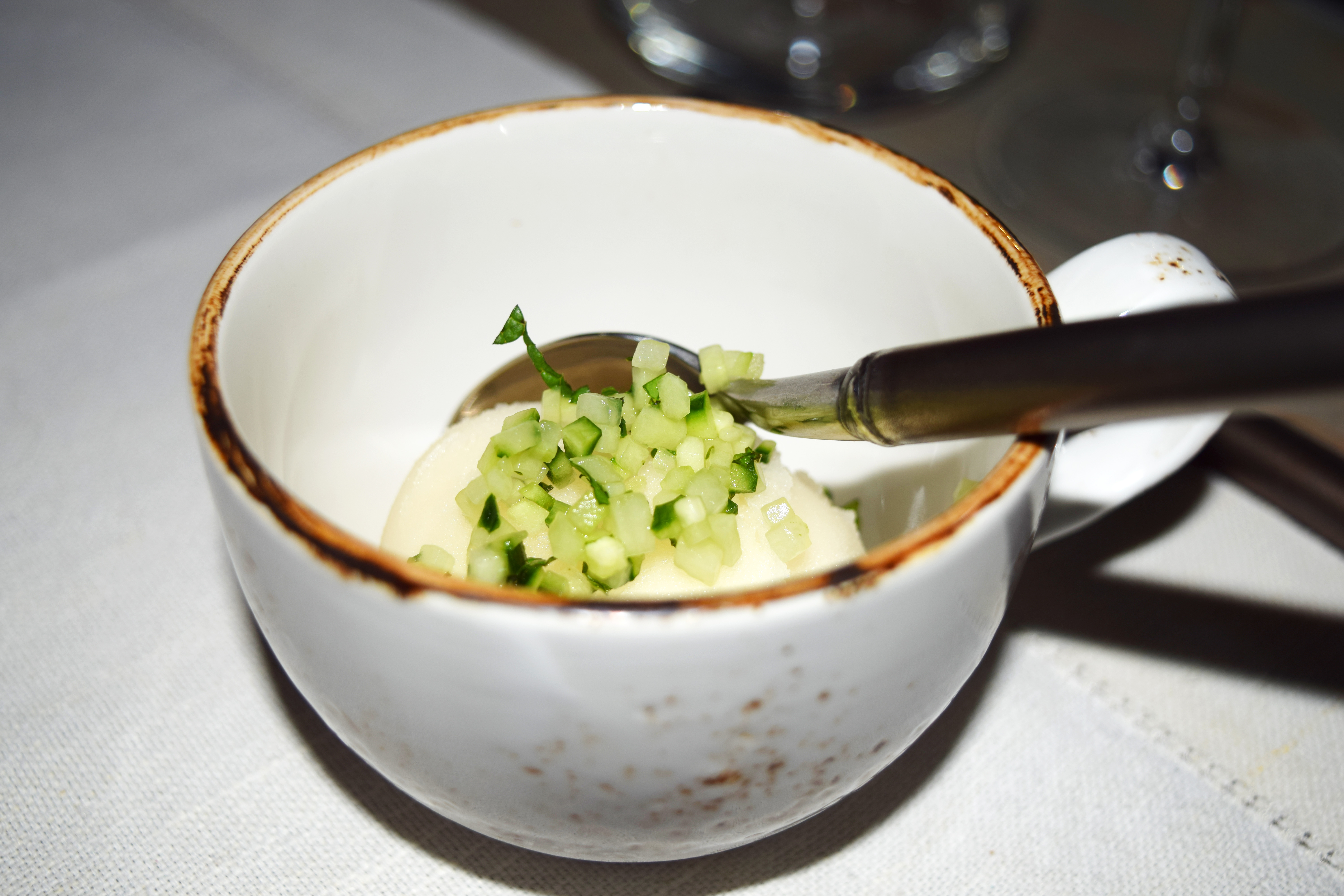 A break for the taste sensations – palate cleanser of pome fruit sorbet. I felt bored and dull when saw that little cup. Either way those were refreshing products – sorbe and chopped cucumber with mint – they couldn’t fill the pause with a good memory.