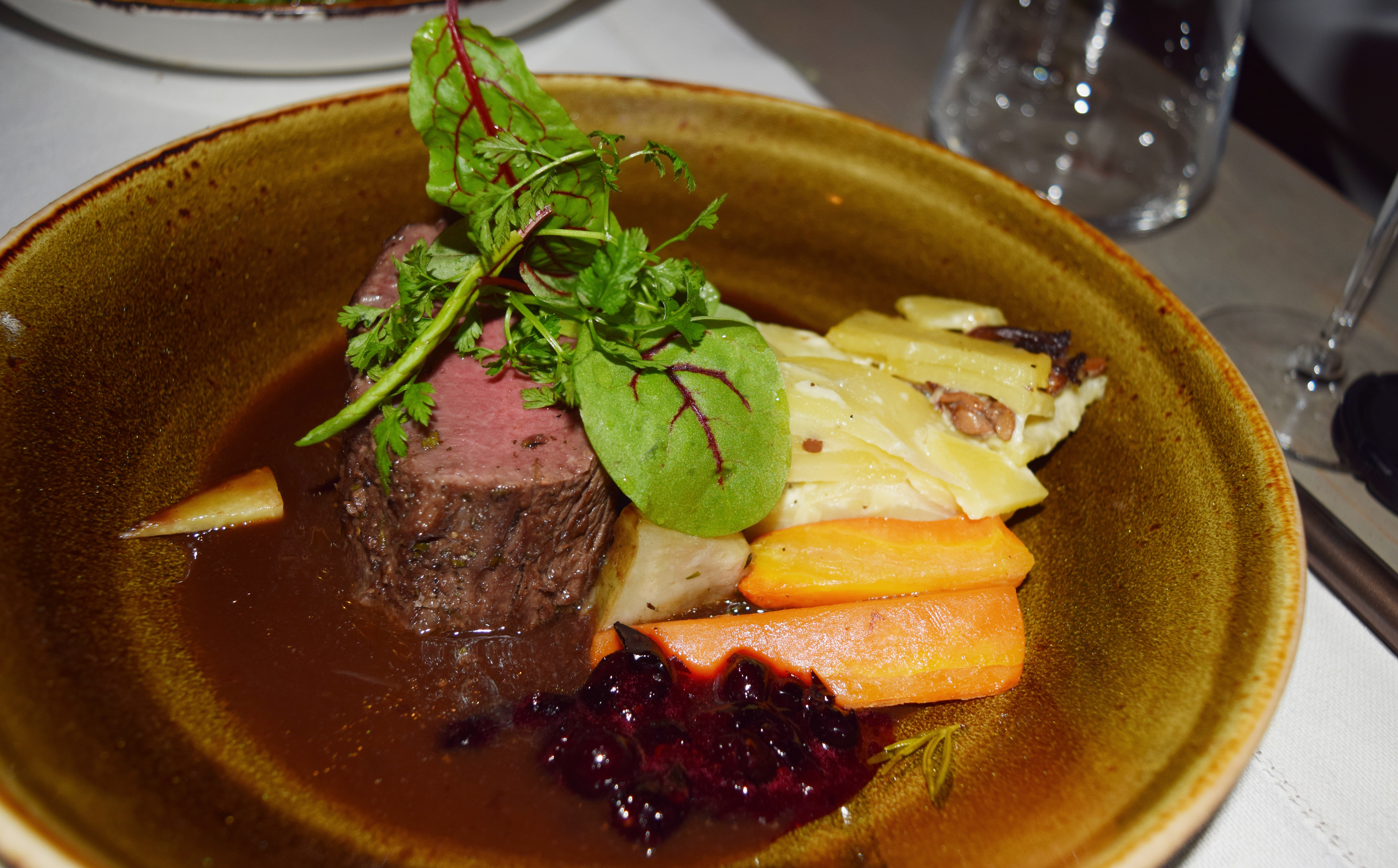 Через 2.5 часа от начала ужина приходит долгожданное горячее блюдо, которое, кстати, есть в основном меню – запеченное при низкой температуре и слегка подкопченное филе оленя, запеканке из картофеля с лисичками, обжаренные овощи и соус из красного можжевелового вина. Мясо поразительно мягкое, местами прямо расплывалось под ножом. Вкус знакомый дикий и мускусный, а вот с разных боков почему-то было неравномерно соленым: то будто горсть бросили, то совсем пресная плоть. Больше всего была в восторге от картофеля с грибами и винного соуса с цельными ягодами – запоминающееся с первого “укуса” и с первой капли – такой сливочный и сладкий контраст.