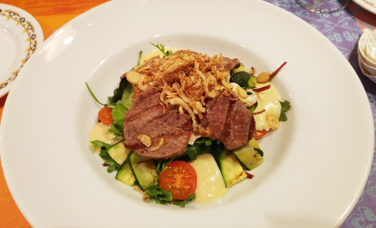 Chef’s salad – salad Brut – tenderloin, grill-zucchini, aioli sauce from baked garlic, shallot chips, champignons, salad mix. Lots of green, which I lacked a bit next to next meat dish; dressing of lime-lemon taste – better to put it fewer. Enjoyed much crispy chips on the salad hill, yet mushrooms underneath I didn’t understand. Why there were here at all, as their plain looks, neither fried nor cooked somehow, didn’t add anything to the salad. There were added many aioli sauce islands, better to put in on the tenderloin, not to mix in the salad itself. The beef was excellent, juicy even if such thin layers. Seasoned a lot with salt – some I wiped off, because general impression of the dish would be too salty. Although neighbour table guests sprinkled both with salt and pepper even more! Tastes differ, but I can argue here about health benefit from salt quantity in one dish.