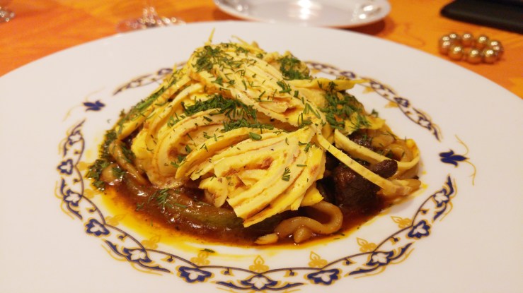 Main dish ordered from Uzbek cuisine part – fried lagman – beef, egg, handmade noodles, fried vegetables, spicy Uzbek sauce. Oh, real man thing going on here! Dish that boils blood and warms your heart. Plate was full of sweet-spicy sauce and oil, so it seemed for me a lagman-soup. Heavy, fatty, plenty of fried beef, plenty of greens, zucchini, garlic, bell pepper and puff noodles. Plenty of everything and my companion was madly in love with this lagman, calling its “fat” a richness. I can definitely agree it was tasty, sweet and aromatic.