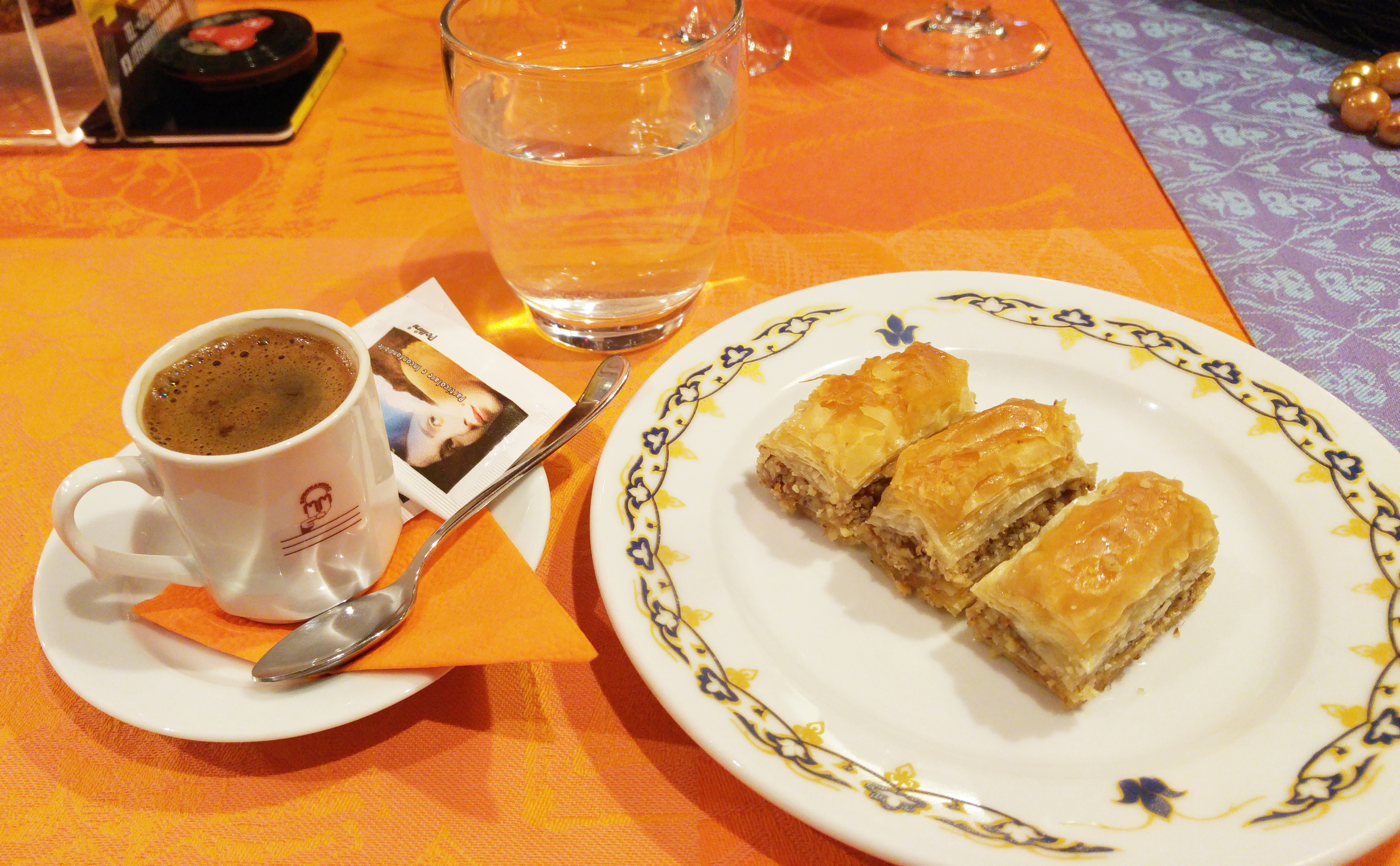 После долгого перерыва и созерцания кухни я решилась на десерт – пахлава и турецкий кофе. Кофе на удивление оказался без щекочущего осадка и был довольно мягким по вкусу – мне как раз. Пахлава, стыдно писать, была словно заветрившейся. Слои фило сверху совсем окаменелостями стали, внизу еще были мягкими из-за пропитки меда и фисташковой начинки. Вкусно, но за свежестью надо следить.