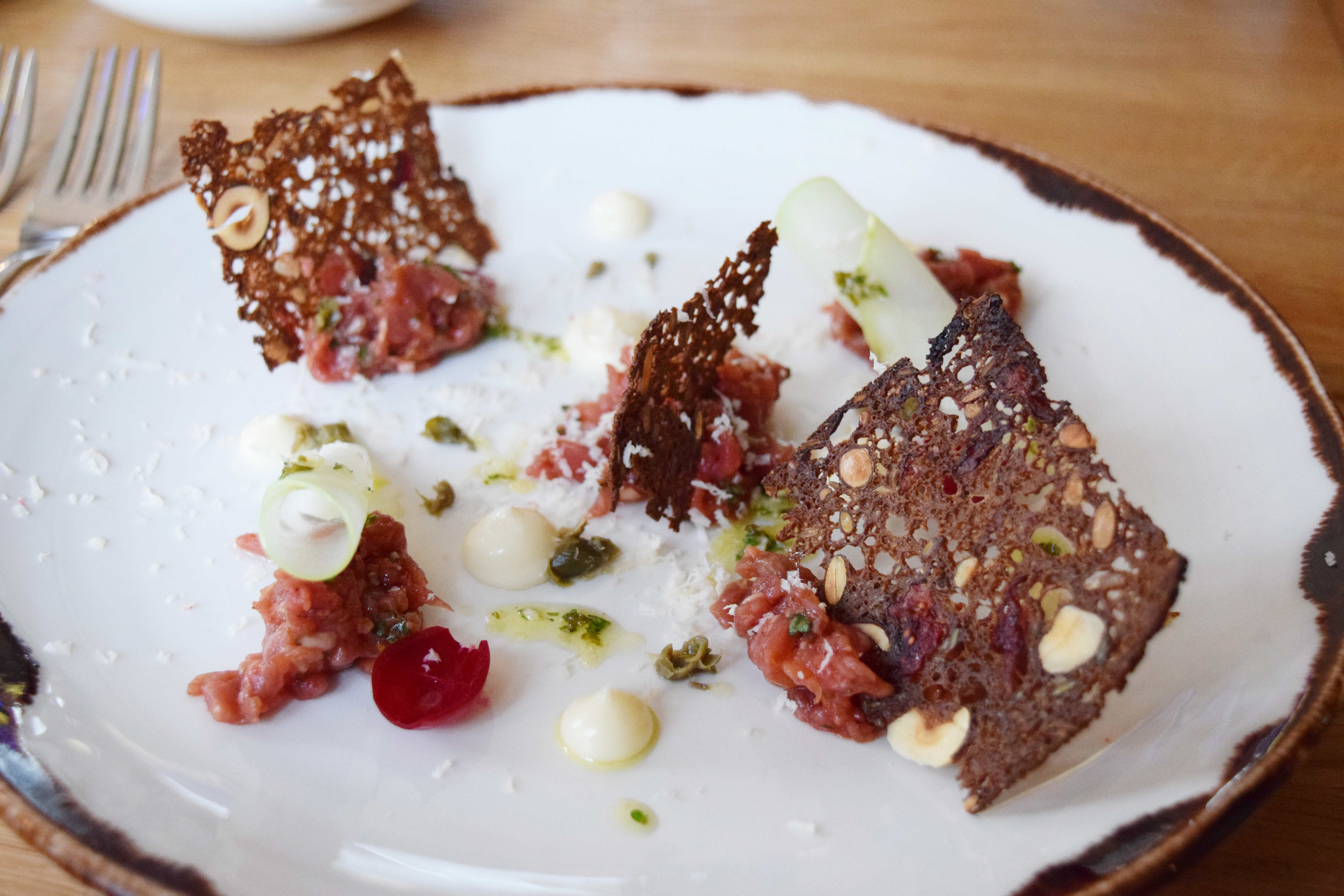 Я не я, если не попробую тартар в новом месте – тартар из говядины Черного Ангуса – хрен, маринованная кольраби, соус гремолата. Первое впечатление от блюда – зачем еще столько ржаных хлебцев, если и в корзинке принесли немало? Второе – мяса было мало, практически на пару канапе насадить и basta. Само мясо еле разделялось и было похоже на сплющенный фарш, не хватало банальных соли-перца, да вот на столе приправ не нашлось. Из пряностей на тартар пришлось намазывать те белые кремовые островки хрена, один раздробленный каперс и хоть для какого-то яркого тона майонез, что подавался к хлебу. Остальные заявленные в меню ингредиенты казались блеклыми.