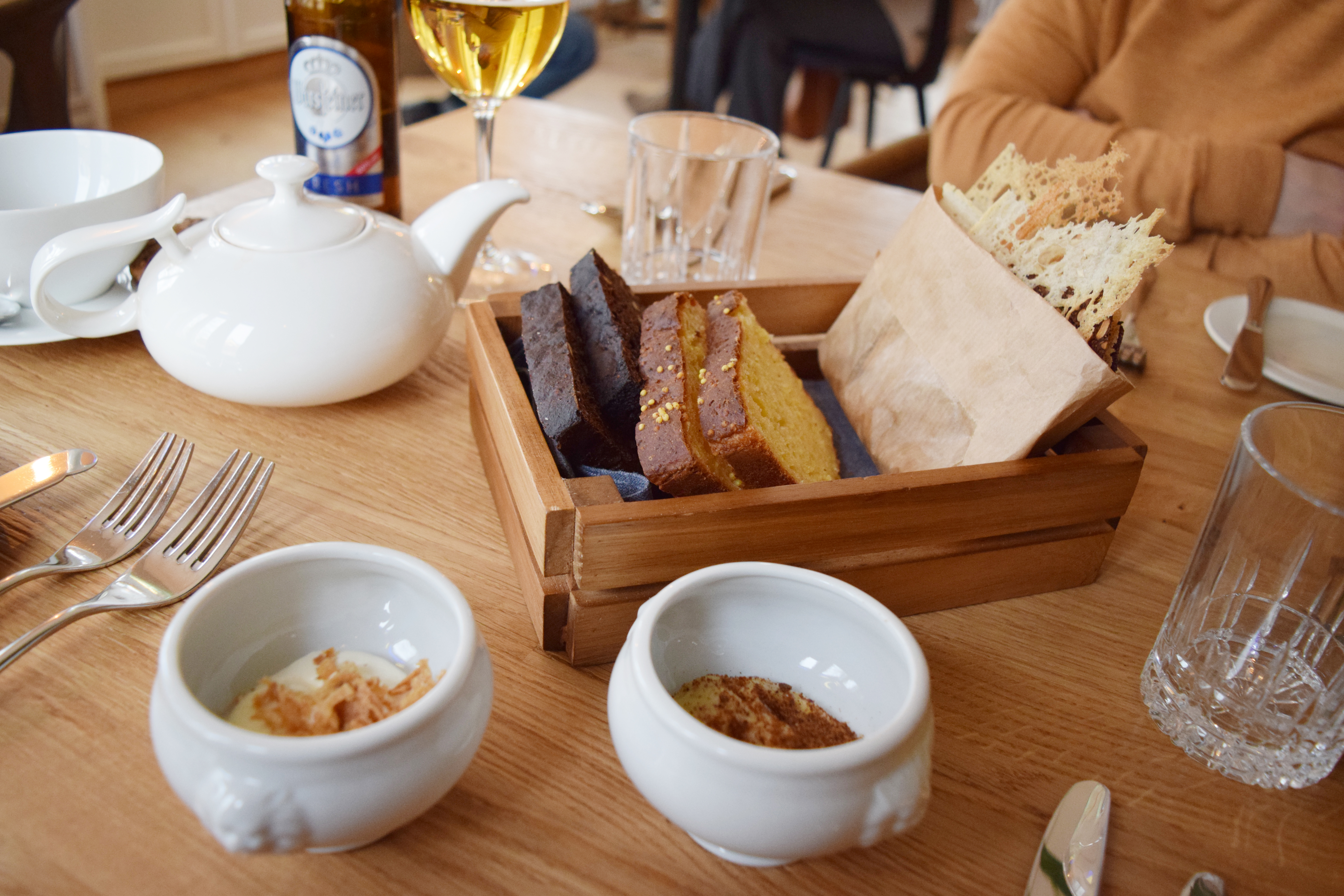 Подоспевает утолить голод интересная хлебная корзинка с всеми глютеновыми страстями ручной работы. Это сушеные ржаные хлебцы с фруктовым хлебом – лучшее, по моему, из всего ассорти. Это пластины белой булки с пшеном – вкусно, но получилось суховато. Наконец, это черный хлеб с тмином – упругий, тягучий, почти что с карамельным или квасовым вкусом. Подается с плошками взбитого сливочного масла в одной и, вроде, сильно уксусного майонеза во второй.