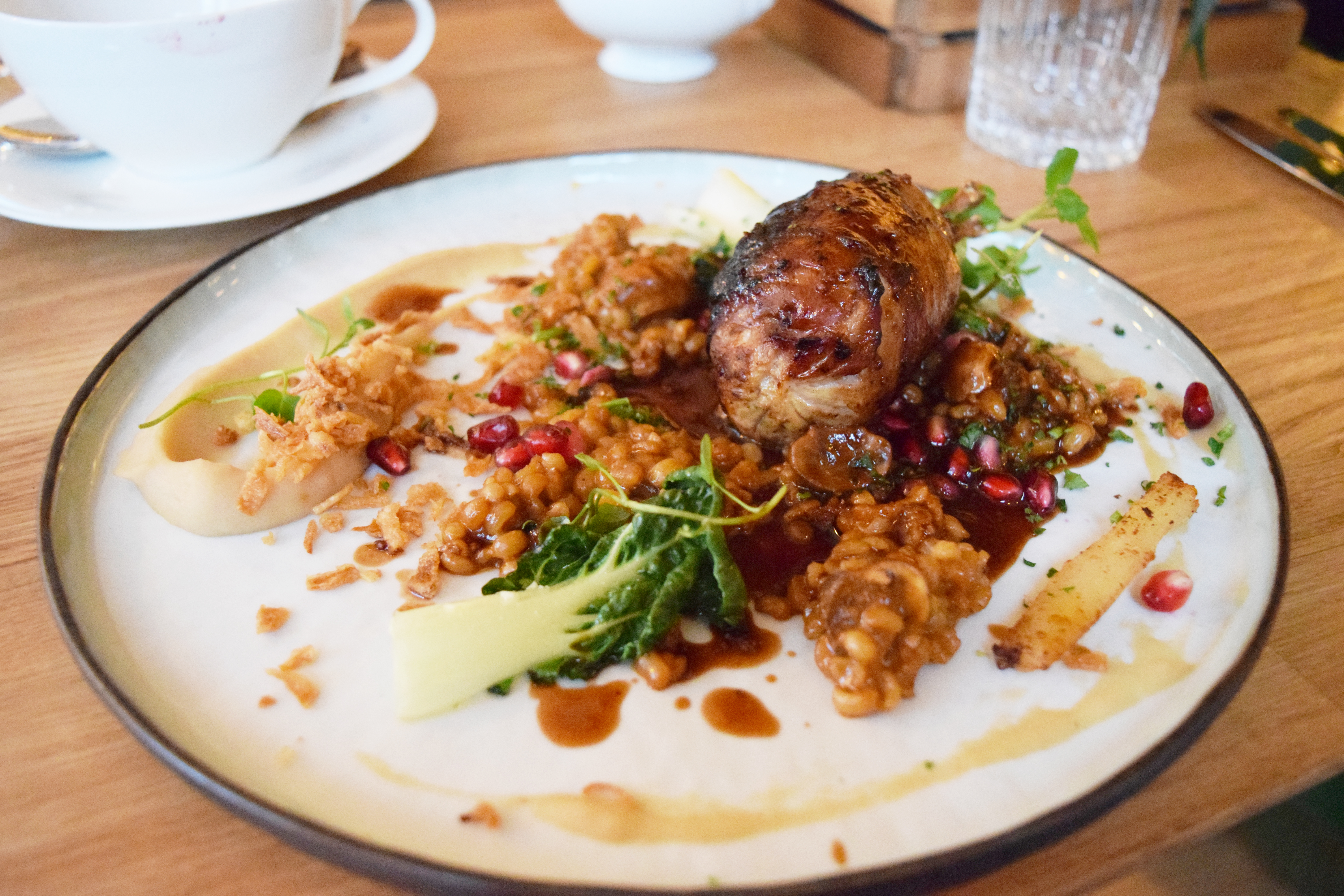 Птичья радость после тартара – жареная перепелка – грибное орзотто, гранат, горчичный соус. Перепелка – большая рулька с зажаренной броней понравилась сильно. Запомнился тот яркий солено-копченый вкус, будто с дымком. Орзотто с грибами как раз не отягощало блюдо и подходило идеально. Не смотрите, что оно растеклось по тарелке – в живом виде перловка не была переваренной. Где был горчичный соус – ума не приложу. Может, та арт-полоска сбоку? Она больше напоминала холодный крем из пастернака. Гранаты – вон с тарелки, а то только в зубах застревали. Лучше тогда соуса гранатового капельку добавить.