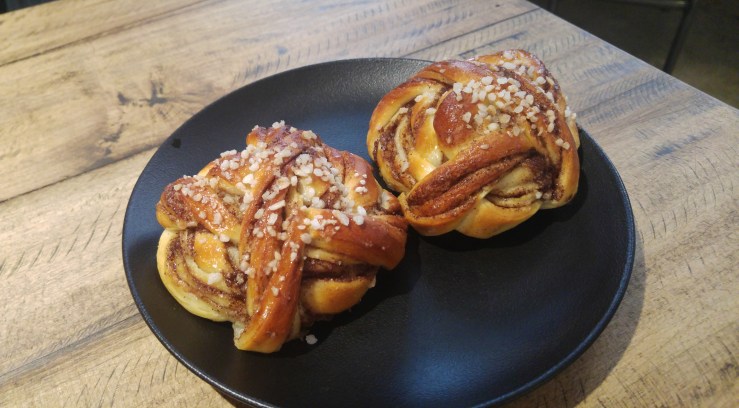 Честно, на пробу хочется взять все: булочки с корицей, сырные Gougere, круассаны, эклеры с фруктами, хлеб из дрожжевого теста, сэндвичи и, конечно же, кофе. Задерживать переминающуюся с ноги на ноги очередь не стоит, поэтому беру отведать уже знаменитые корично-кардамоновые булочки с капучино. Кофе очень крепкий, так что бесплатная вода в графинах мне пригодилась. О сладости и глазури, приправах заморских и пышном тесте булочки буду слагать легенды и нести их в массы!