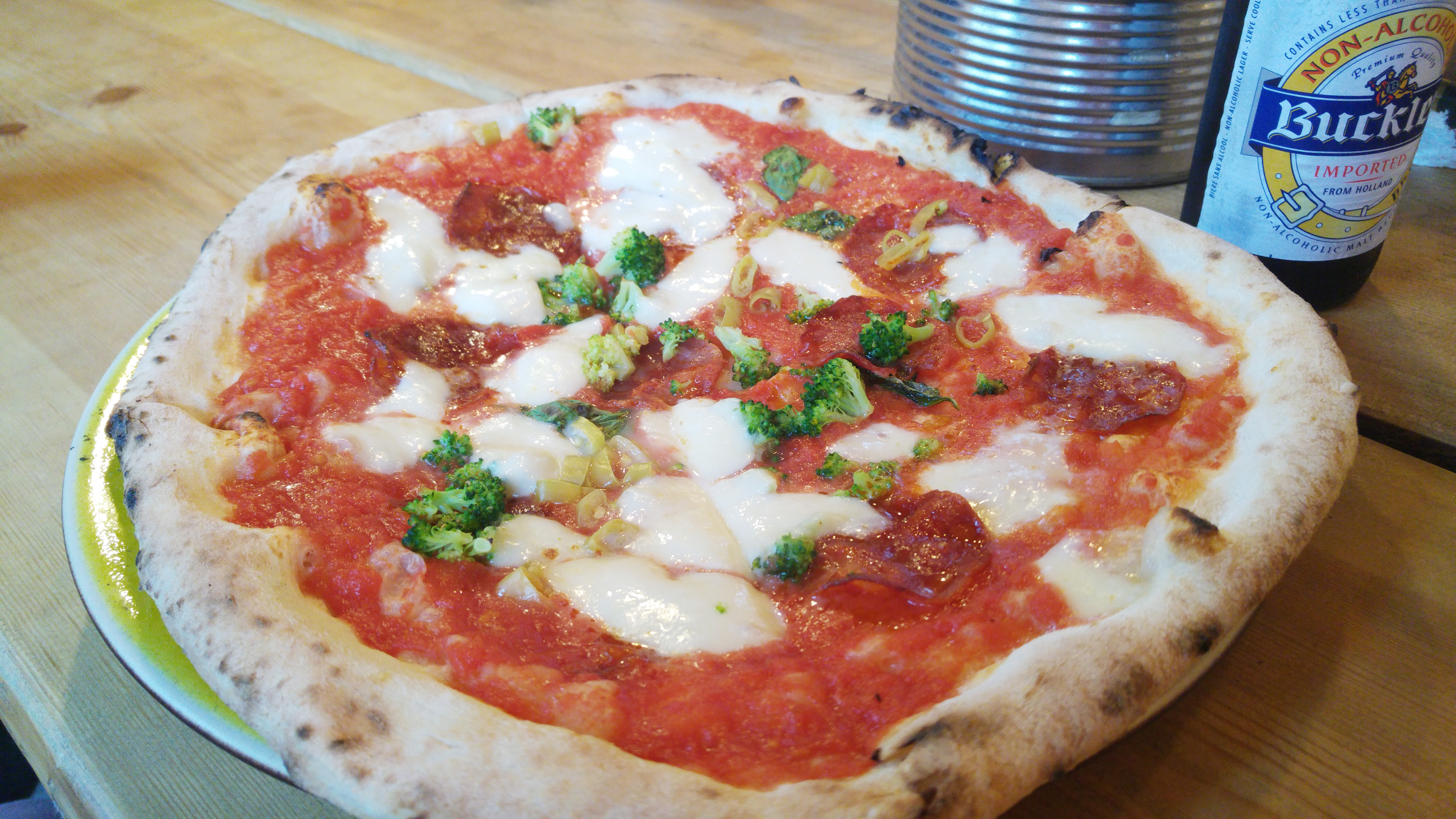 Second pizza, more rich – tomato, mozzarella, cured chorizo, broccoli (why?), fresh chilli. Chorizo is a go-to staple, chilli – ideal spiciness without other flavours interruption. As a matter of fact, there are hotter sauces to offer on the table, for instance, Tabasco. Oh yes, let’s add Tabasco too! Broccoli adds more colour that taste. In general, I liked the nr 6 pizza also.