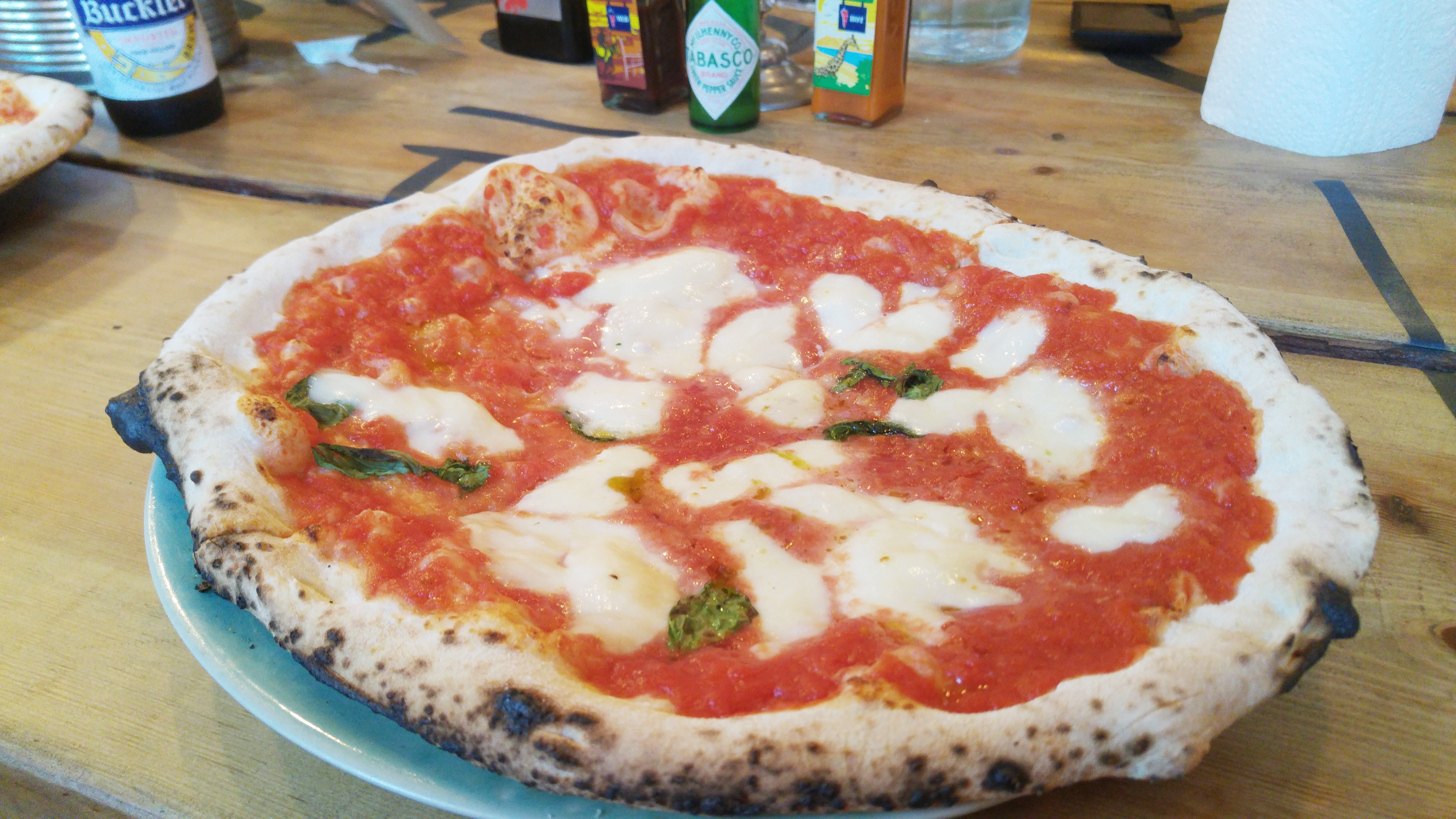 Interior and atmosphere. Only 30 minutes passed after Saturday opening and small pizzeria is packed. Add more 10 minutes and you feel like sardines in a jar. I find it useless to describe how many chairs there are, or how much those stylish lamps etc cost. You get the point right away: eat fast and free space for next guest. There is no time to look around actually, because pizza is ready in a blink of an eye. I got lucky to enjoy it at single wooden table on the spot. Of course, you sit beside strangers but all were kind and merry.