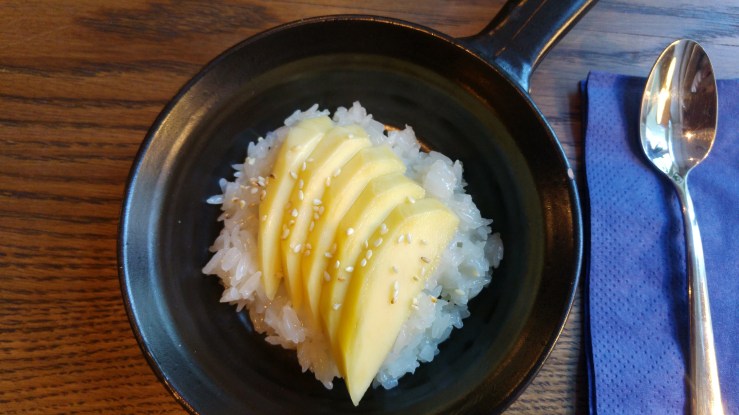 Десертов не так много, поэтому один из четырех был выбран KHAO NIAO MAMUANG – сладкий клейкий рис, спелый манго. По отдельности пластинки фрукта с кунжутом и кокосовый соус были отличным сочетанием. Рис разжевать не представлялось возможным, никак. Сложно воспринять нежный манго и резиновый рис вместе. Не понравилось или я что-то не понимаю в тонкостях восточной тайской кухни.