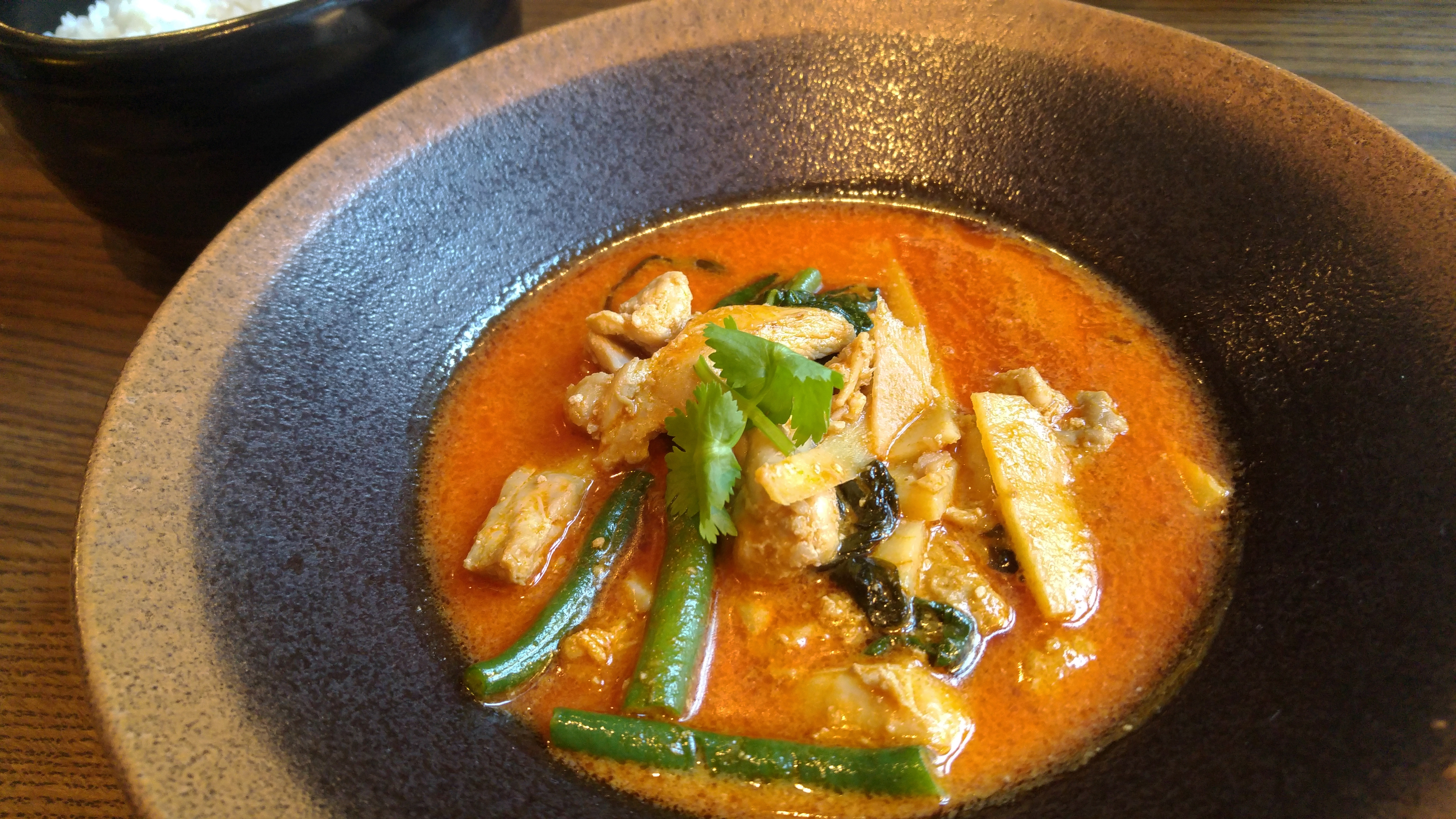 Основное блюдо – KANG PED ** – красный карри с побегами бамбука и курицей на выбор. Смутили сразу воткнутые ложки в тарелку и бочонок для риса. Заранее то зачем? Остроту попросила убавить с 2 до 1, так что обед прошел без слез. Фасоль, бамбук, листья кале, ароматный бульон, рис, отварное филе курицы – вот скромный набор. В соседних наименованиях блюд было больше овощей и приправ, которые ожидала увидеть в карри-блюде. Не могу оспаривать аутентичность, но общее впечатление от блюд хорошее, но не замечательное.