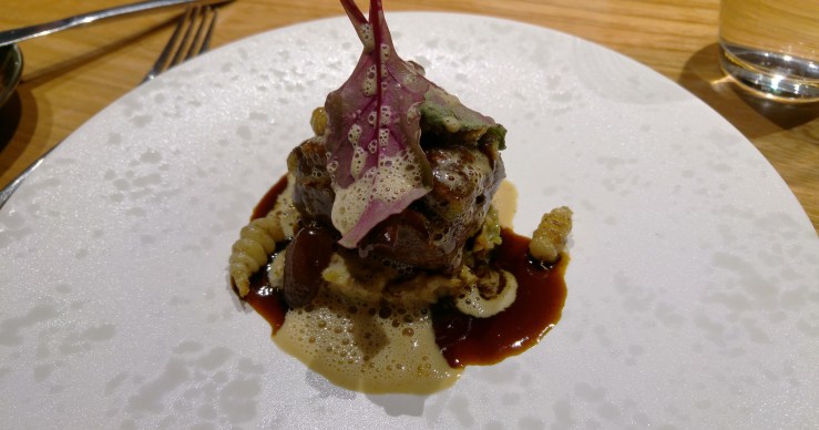 The familiar smell already reaches from kitchen – it is the first starter – Oxtail, parsnip foam and dehydrogenated onion. Go-to staple mix of meat and vegetables – though fibres are thin, but all tastes weren’t mixed into unrecognisable mass. It’s a similar dish from last season. Since then I still haven’t found any restaurant, who could actually reach same level of oxtail execution. Superb.