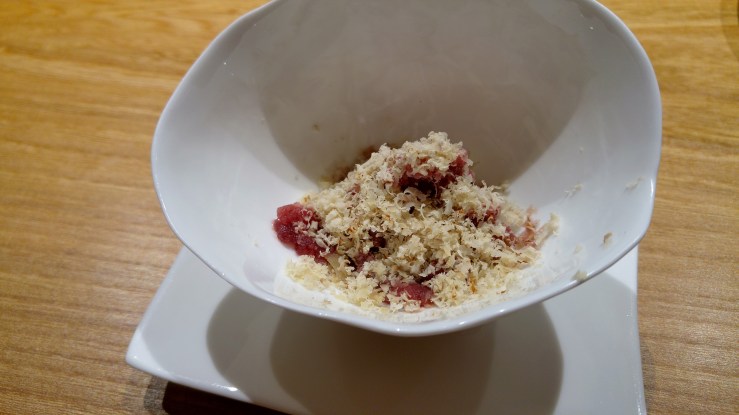 Знакомый запах уже доносится с кухни – это первая закуска – бычий хвост, пена из пастернака и дегидрированный лук. Беспроигрышный микс из мяса и овощей – хоть и мелкие волокна, а все вкусы не смешаны в неузнаваемое месево. Похожее блюдо с прошлого сезона. С тех пор так и не нашла ни одного места, кто мог бы хоть на йоту приблизится к такому исполнению бычьего хвоста. Супер.
