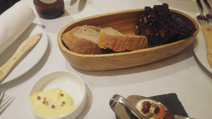Artisanal grey and black bread with dried fruit and butter. It was right about time for the entertainment as meal pauses were long.