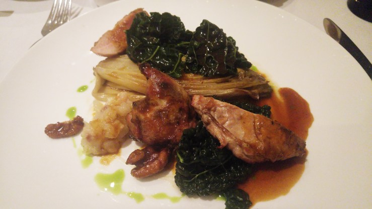 Шок вечера – Куропатка с цикорием, карамелизованное яблоко и грецкий орех. Дичь – дело тонкое, упрямое и сложное для приготовления. По крайней мере, так мне представилось по результату кухни, поскольку есть это было трудно. Мясо не поддавалось ни стандартным, ни вторым, более острым ножом, полученным по просьбе. Еще чуть-чуть, и вывих запястья был бы гарантирован. Бросила. По вкусу была куропатка как недоваренная куриная нога из морозилки. Мертвая, пресная, едва приправленная. Неприятно горькая капуста осталась нетронутой: как ее поставили в пару с дичью, ума не приложу. Соус хороший – на этом похвалы закончились.