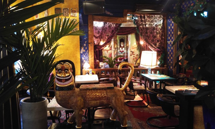 Интерьер. Дали с Роршахом призадумались бы, в чем суть этого… нагромождения от пола до потолка. Для бара – заманчиво, весело; главное, будучи трезвым по сторонам не смотреть. Для ресторана – неподготовленному гостю лучше смотреть в окно или в свою тарелку, поскольку глазу остановится на чем-то спокойном невозможно. Через полчаса возникает ощущение беспокойства и желания поскорее уйти, но это из субъективных недостатков. Из явных минусов – запахи с кухни по всему залу, холод, грязные туалеты.