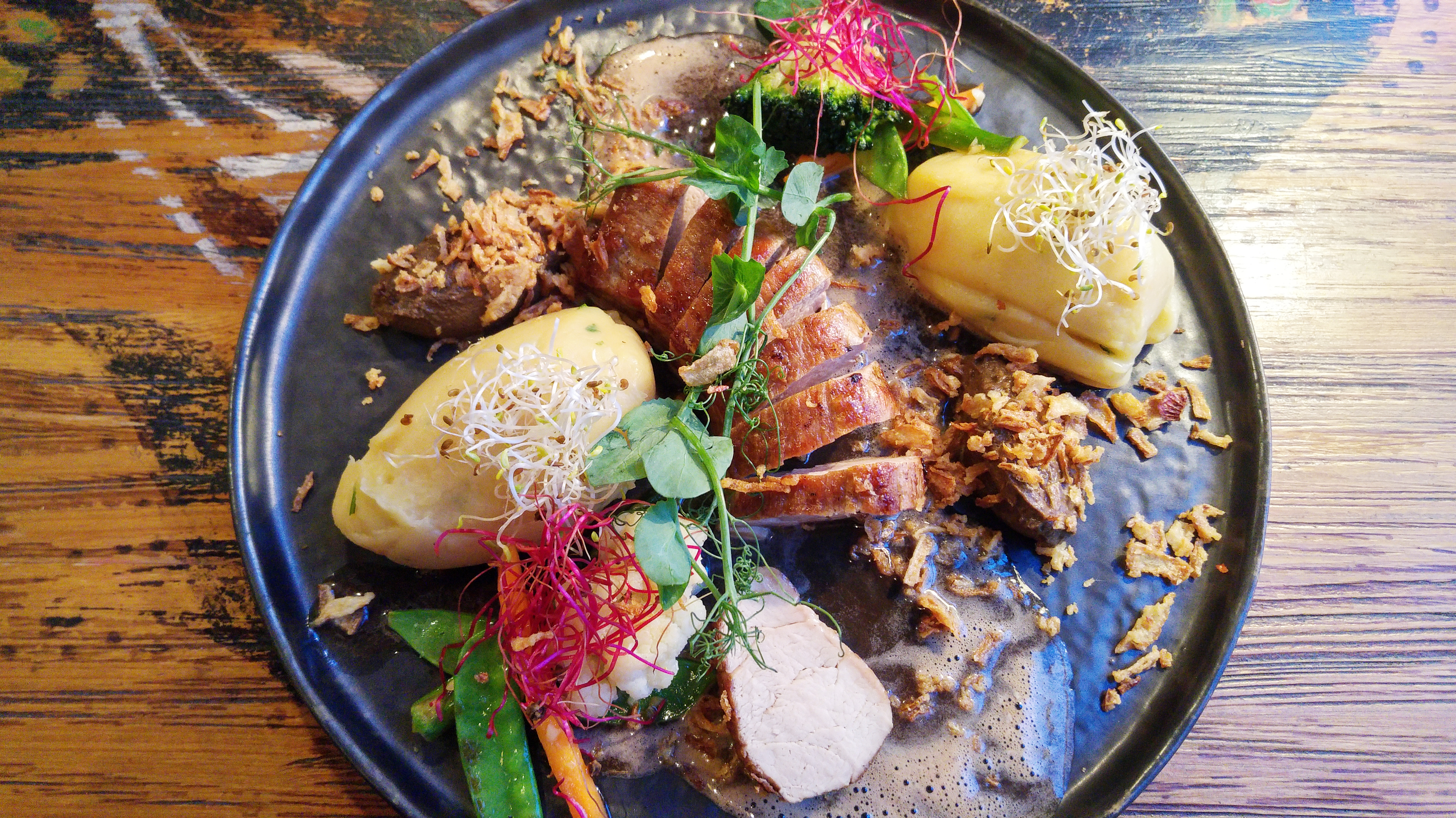 Half an hour break – we wait for Pork tenderloin – wild mushrooms cream, smoky potato mash, Vana-Tallinn sauce. Arrives and….leaves. I returned the meat: awfully dry, overdone in oven, and hardly seen crust tightly stuck to the flesh. Sorry, piggy. I didn’t catch sauce – invisible on a plate and totally intangible. Mashed potatoes – were normal, even one quenelle would be enough. Two spoons of mushroom mousse – were satisfactory and more similar to liver paste until you remind yourself those were mushrooms. This dish was a hit of sales in the summer 2017, the waiter says. I don’t believe our guests are so blind. Or everything is done for the tourists?