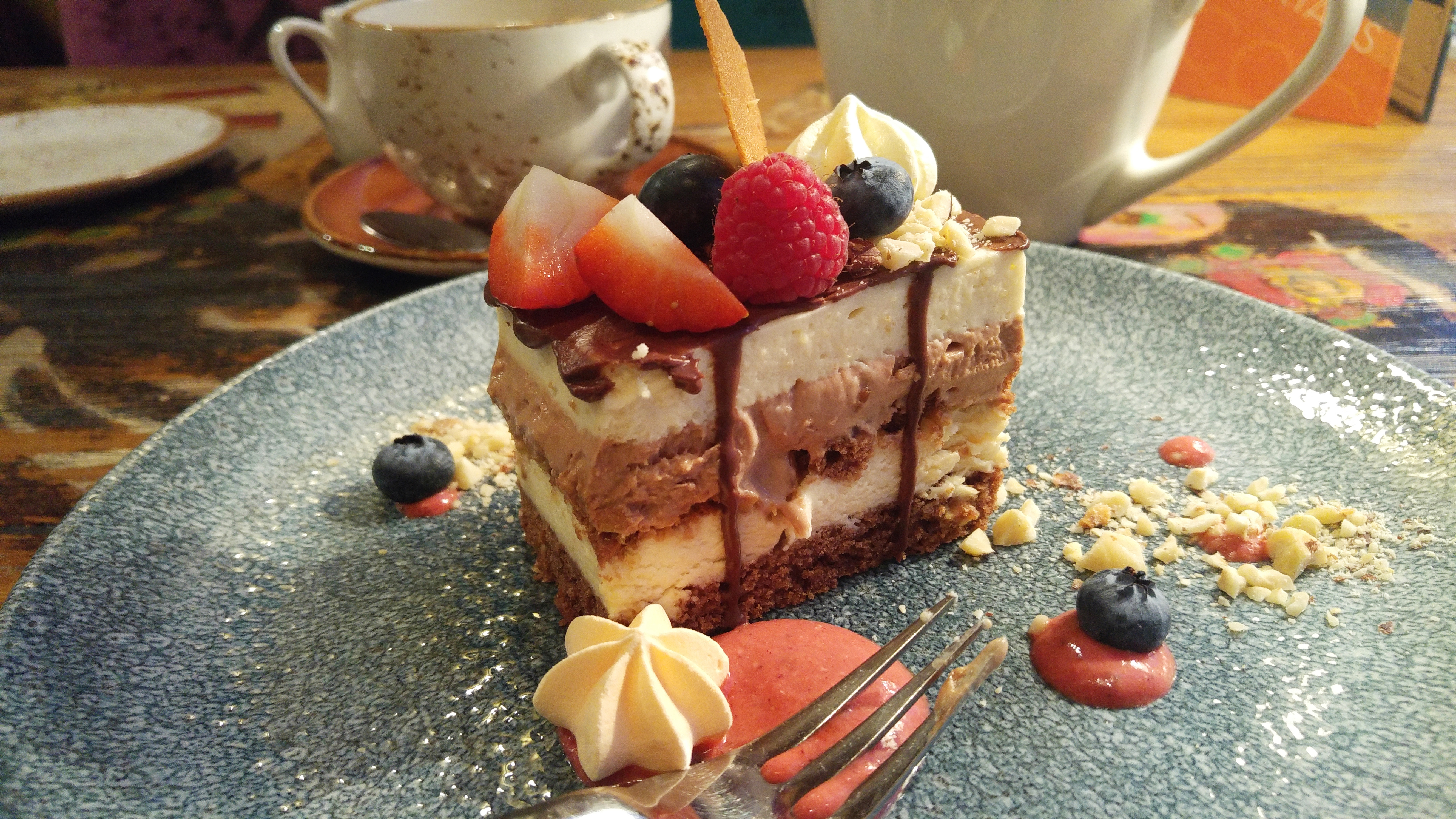 Еда. Небольшое меню, буквально неделю назад обновленное. Что делать, когда ни одно из них не привлекло? Хуммус, pate, тартар, мидии, осьминог, свинина, баранина, антрекот и еще с дюжину стандартных безликих наименований. Еще б Цезарь, пиццу, суши, кальян, и был бы полный комплект. Заинтересовал только один десерт, так что ради него пришлось проделать долгий путь мытарств на два часа.