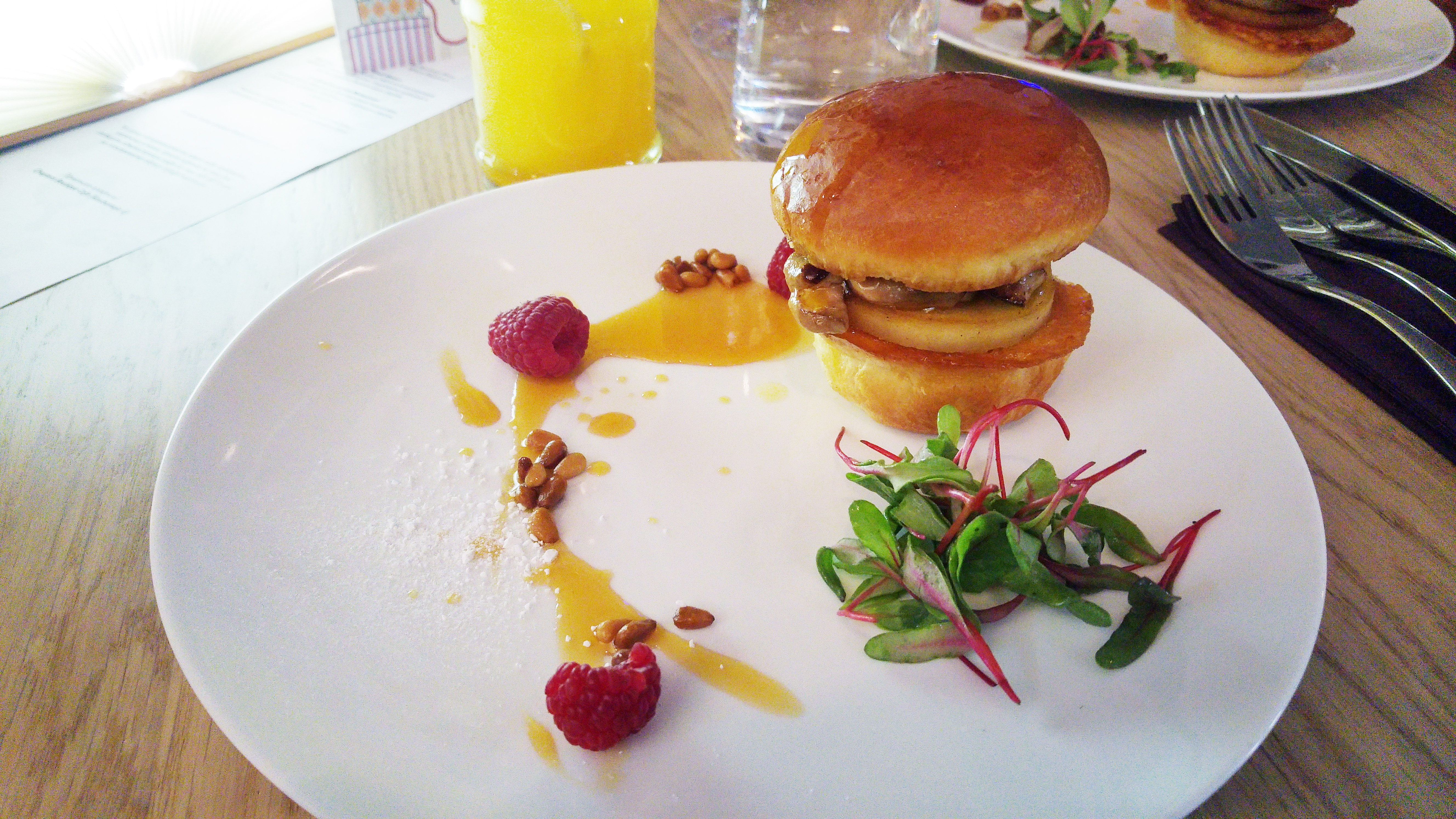 Еда – красота! На закуску – Теплый визит – Фуа-гра с кексами бриошь, карамелизованным яблоком, свежими ягодами, кедровыми орехами и кисло-сладким беловинным соусом. Зажаренные мини-бургеры с нежным фуа-гра, будто под кленовым сиропом. Вместе сладко и задорно.