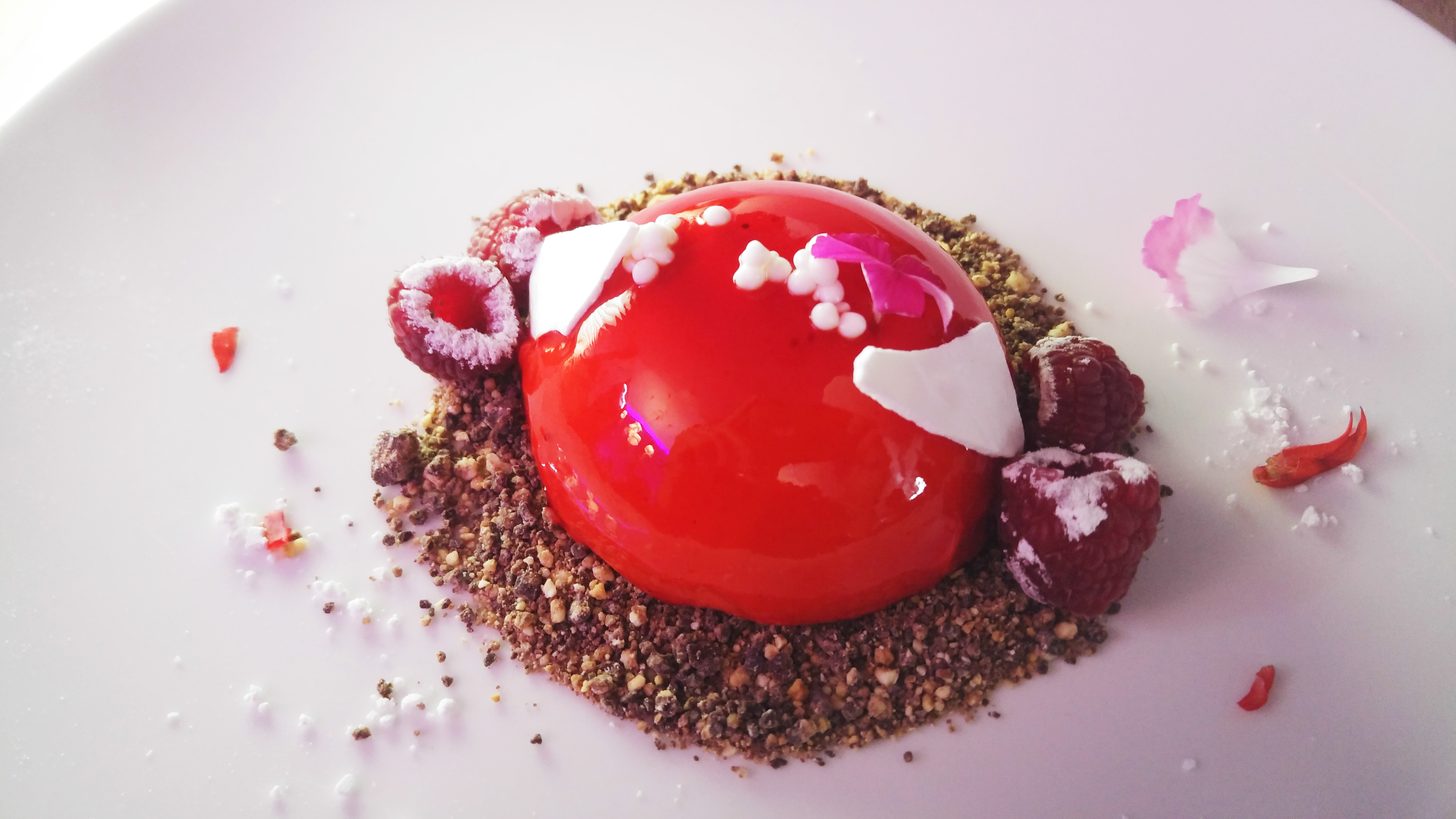 Десерт Теффи – Панна-котта с эстрагоном в клубничной глазури, с кокосовыми гарнулами, свежей малиной и безе. В одном названии только 99.99% совпадения по моим любимым ингредиентам. Боком стоит лишь эстрагон, но он настолько легко оставляет шлейф вкуса, что радость мою своим присутствием не омрачает. Зеркальный глянец купола, зеленая начинка – модный тандем открывается в разрезе. Десерт-развлечение, десерт-сюрприз, который, как видела, с нескрываемым удовольствием ели все. Браво!