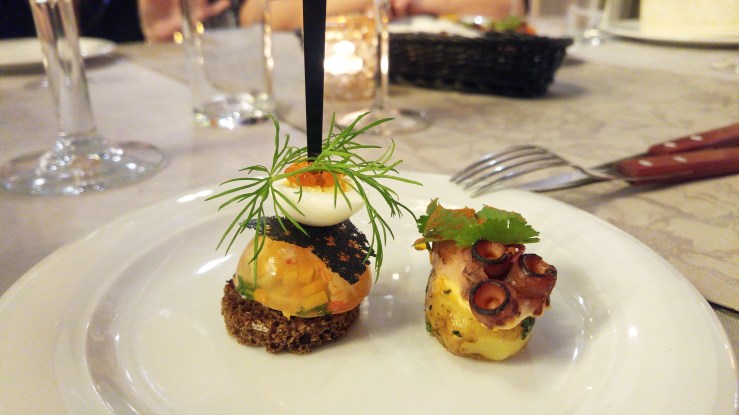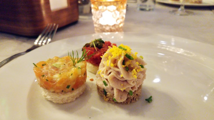Закуски Беф а-ля тартар, Тартар из лосося в чипсе из крабовых панцирей и Форшмак из голландской сельди Матье (Kitchen Rõõm). На первое место из поданного трио ставлю форшмак – кремовый, совершенно не узнаваемый. Обязательно отведала бы такое вновь. На второе место водружаем тартар рыбный – легкий и нежный, от чего даже булка казалась слишком грубой на его фоне. Бронзу берет суховатый и слишком острый тартар мясной. Цельные каперсы были излишни для такой мини-порции.