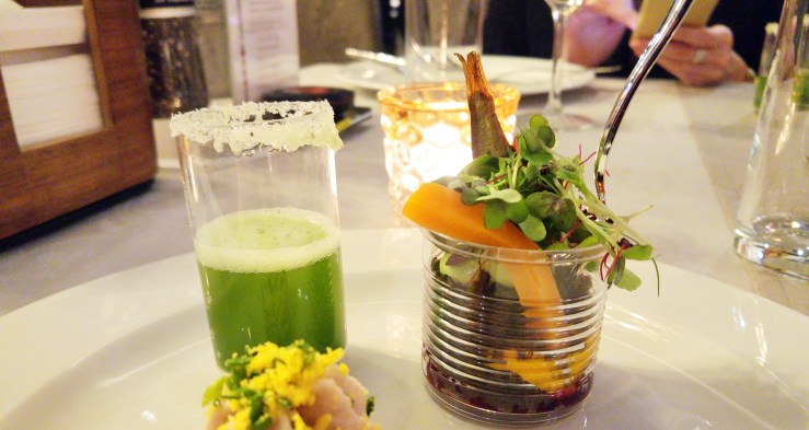 Amuse bouche – Архитектура вкусов Koppert Cress Mother Earth (Promo Food Service Chef Ambassador, Евгений Генералов). Миниатюрный мир цветов, запахов и вкусов: кресс-салат, хлебная крошка, шпроты (?), морковь и некий связующий крем. Запивать это удивительное творение следовало яблочно-травяным напитком. Это очень необычно, начиная с внешнего вида и заканчивая Земной идеей и ее воплощением. На вкус – как (почти) вегетарианское блюдо, только более ароматное. Совершенно другой уровень блюда, который только предстоит постигать.