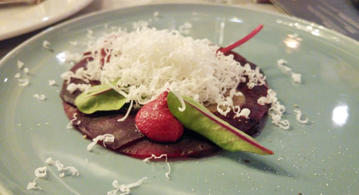 Закуска следующая – Карпаччо из свеклы с козьим сыром (Art Priori, Александр Коломар, Владислав Боровик). Отличный стимул побыстрее мне собраться в Art Priori. Это супер: простое, зато идеальное сочетание сливочного сыра со сладкой свеклой. Кто привнес это в мир – дайте пожму ему крепко руку.