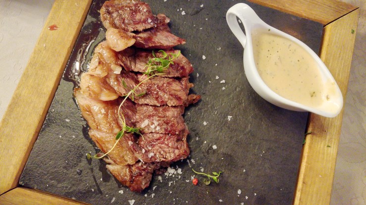 Так как на очереди оставался только десерт, а запахи с кухни сильно манили, пришлось заказать по стейку Пиканья под перечным соусом. Кстати, или я плохо ищу, или действительно не так много мест эту часть бычка гостям предлагают. Полоски жира, чур, не пугаться, ведь он дает ту самую дополнительную сочность. Советую!
