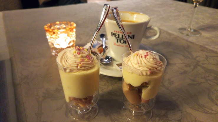 Долгожданный десерт после салюта – вкусы и текстуры смешались в сплошное удовольствие. По ощущениям показалось наличие марципана, маскарпоне и крема с вишневым вкусом. Сладко очень, зато с кофе гармония восстановилась.