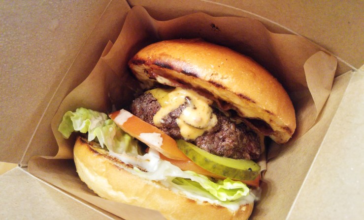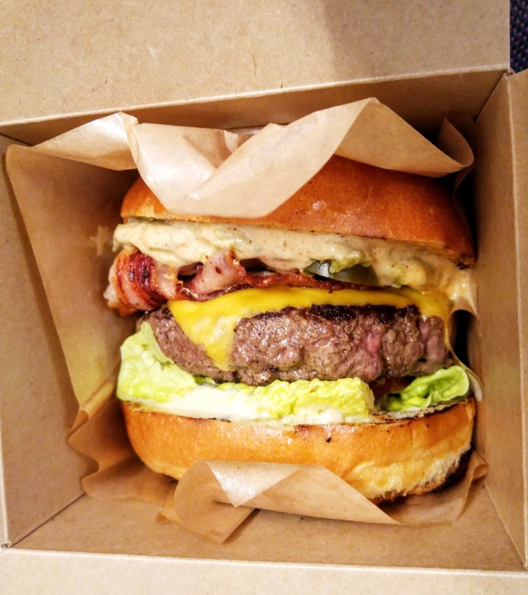 Вторая попытка – это бургер Bacon (7 евро) – 100% говяжья котлета, хрустящий бекон, салат, помидор, маринованный огурец, майонез чипотле. Котлета замечательная, все той же идеальной средней прожарки. На фоне предыдущего варианта этот бургер приятно соленый; не плавает в луже жира, а источает мясной сок. Румяная булочка и достаточно соуса. Придраться абсолютно не к чему, советую!