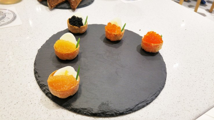 The next delicacy – caviar in the crispy cups with sour cream and quail egg. I think it’s an excellent idea to offer several types at once. It will help you upon caviar purchase and develop your taste as well.