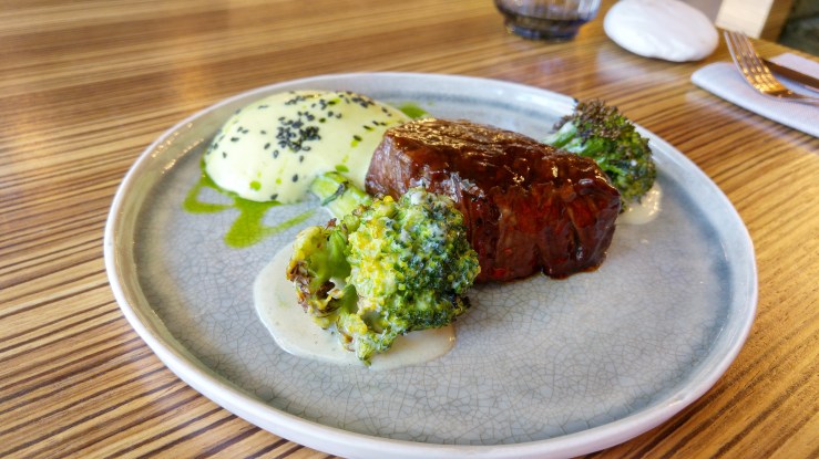 Говядина – брокколи-гриль, Горгонзола соус, крем из порея. Мясо медиум обжарки – ребята, ну так же нельзя! Это превосходная, сочная говядина с убийственно вкусным соусом. Рядом воздушный, невесомый мусс из порея – такого я еще не ела, похож на горох и порей одновременно. Я ничего не имею против брокколи, но теперь я просто влюбилась. Шутки прочь. Под ней был соус из сыра горгонзола, и когда он смешался на брокколи с соусом для мяса, то произошел коллапс. Вакуум, где остался только восторг. Спасибо, это блюдо запомнится надолго!