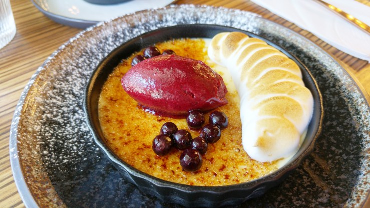 Со слов официантки самый популярный десерт – это крем брюле – медовая меренга, сорбет из черной смородины с базиликом. Берем, тем более, что здесь можно брать все не глядя. Крем брюле действительно хорош: без приторности сладкий крем, обоженная меренга (можно съесть кило такой красоты!), сорбе из черной смородины и ягоды. Растворяешься и смакуешь. Элегантно и со вкусом!