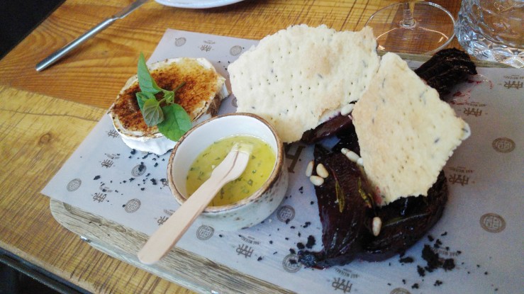 Раз часть заведения – производство сыров, значит, мимо них я не должна пройти. Закуска первая – Каленый козий сыр, печеная свекла в пивной глазури. Пресловутым или надоевшим такой вариант козьего сыра язык не повернулся сказать. Отличная карамельная корочка и медовая добавка сверху – ужасно вкусно. Сам сыр – вязкий, приятный. Печеная свекла с кедровыми орехами – знакомый вариант сочетания продуктов, беспроигрышный. Жаль, пивного оттенка сильно не почувствовалось.